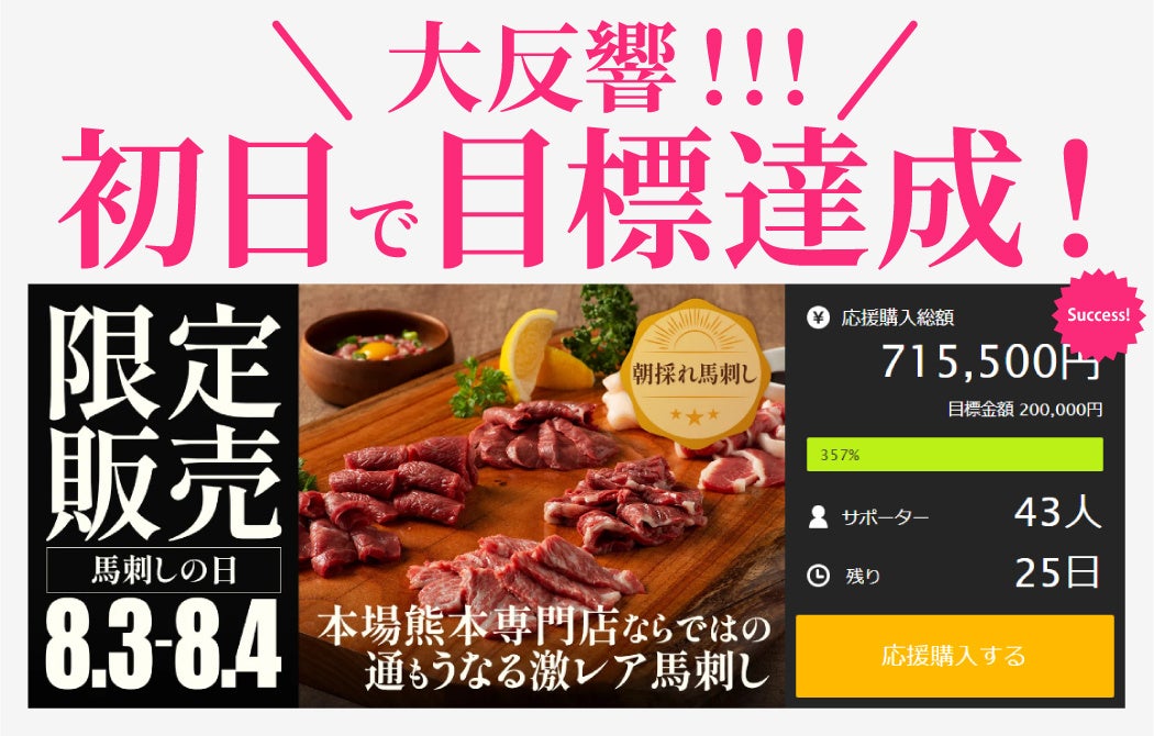 株式会社フジチク(本社:熊本県菊池郡菊陽町 以下:フジチク)はクラウドファンディングサイト Makuake にて、7 月 14 日から【8 月 3~4 日 馬刺しの日限定会見!捌きたて朝採れ馬刺し】を 8 月 8 日まで限定販売を行いました。