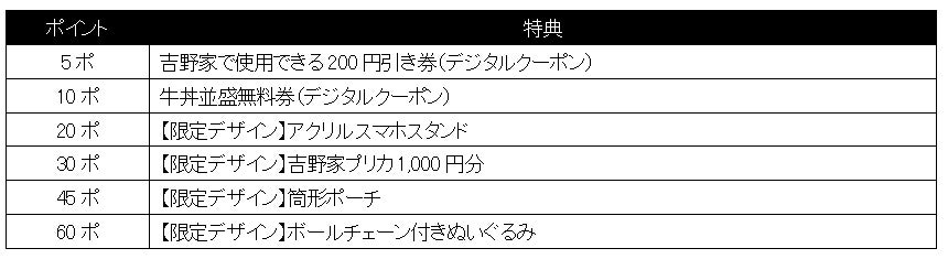 『牛ポ!』は吉野家公式アプリをダウンロードして参加するポイントキャンペーンのポイントのことです。全国の本キャンペーン実施店舗にてお会計をする際、公式アプリ内の専用バーコードをレジにて提示すると、税込500円ごとにつき「1ポ!」がアプリ上に会計日を含めて4日以内に付与され、累計ポイントに応じた特典をもらえます。特典は吉野家店舗で会計時にお得になるデジタルクーポンをはじめ、アクリルスマホスタンド、吉野家プリカ(1,000円分)、筒形ポーチ、ボールチェーン付きぬいぐるみなどここでしか手に入らない【限定デザイン】のオリジナルグッズを用意しました。