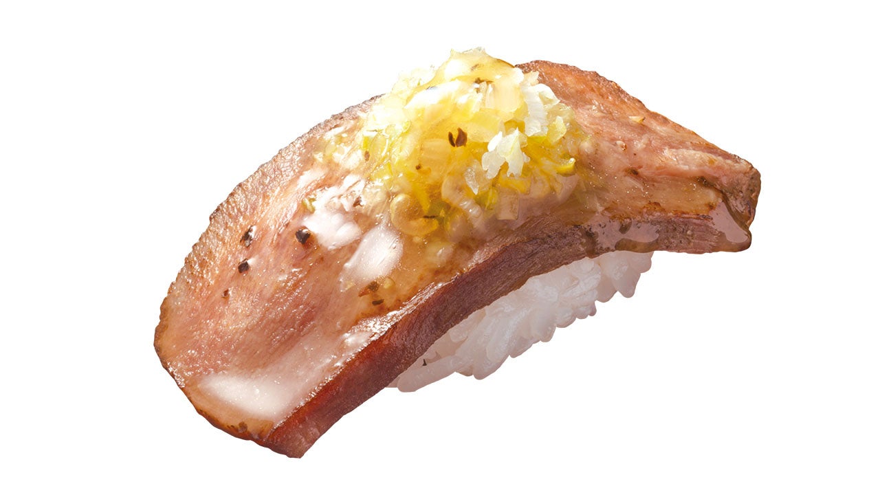 また、上品な旨みのキスをサクサクの天ぷらにした「きすの天ぷら握り」や香ばしく焼き上げたまぐろを大葉の爽やかな風味とにんにくが香る醤油で上品に味付けをした「直火焼きまぐろ(大葉にんにく風味)」、炙った牛たんにごま油と粗挽き胡椒が香る塩だれをかけ、刻みねぎをトッピングした「炙りねぎ塩牛たん握り」、スパイスが香るチキンにピリ辛の特製サルサソースを組み合わせた「サルサチキンサラダつつみ」も登場します。至福の一貫シリーズから販売する、濃厚な旨みとなめらかな舌触りが特長の「うに軍艦」にも注目です。
