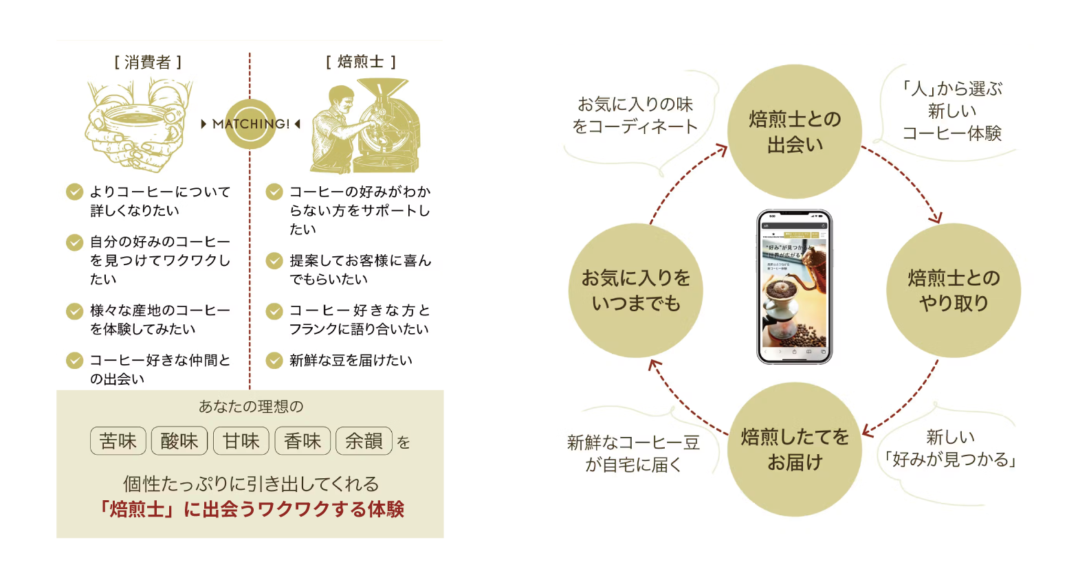焙煎士はマッチ率のいい消費者に対して、おすすめのコーヒー豆の提案やをかけることが可能で、より親密な関係を築くことができる。