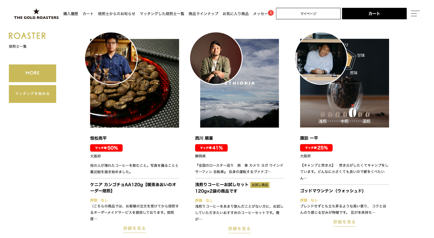 「THE GOLD ROASTERS」に所属している焙煎士の好みや取扱豆が登録されいる状態で、消費者がコーヒーの好みについて11項目を入力しコーヒー診断を行い、おすすめの焙煎士(コーヒー豆)のマッチ率が数値で表示される。