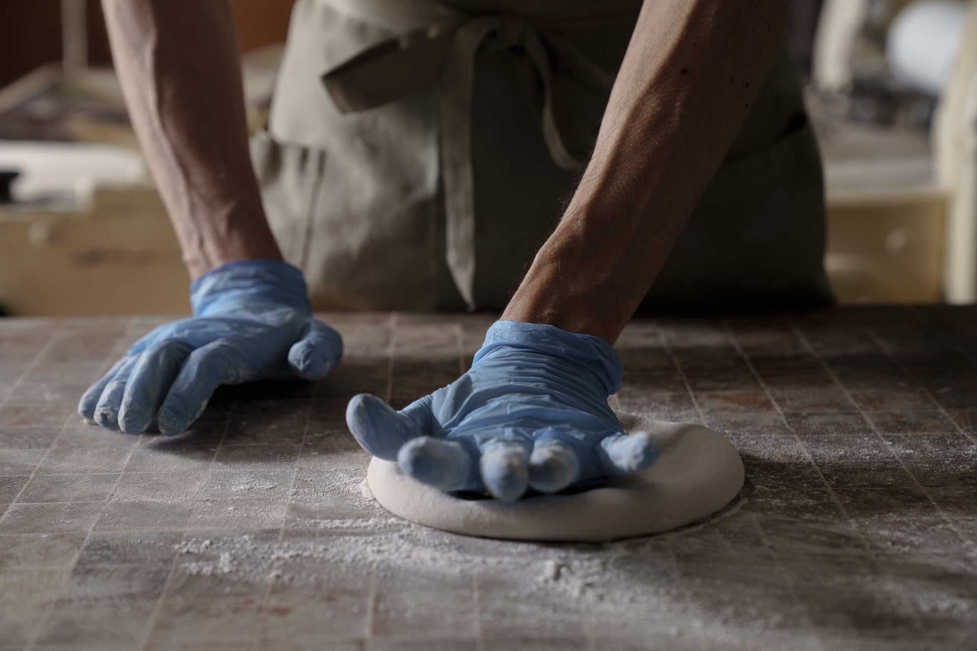 ピザ特有のもちもちでフワッとした生地を作るためには「手で伸ばす」しかありません。職人が一枚づつ生地を伸ばし、星型に成形。ミミにクリームチーズが入っているので最後までおいしく食べられます。