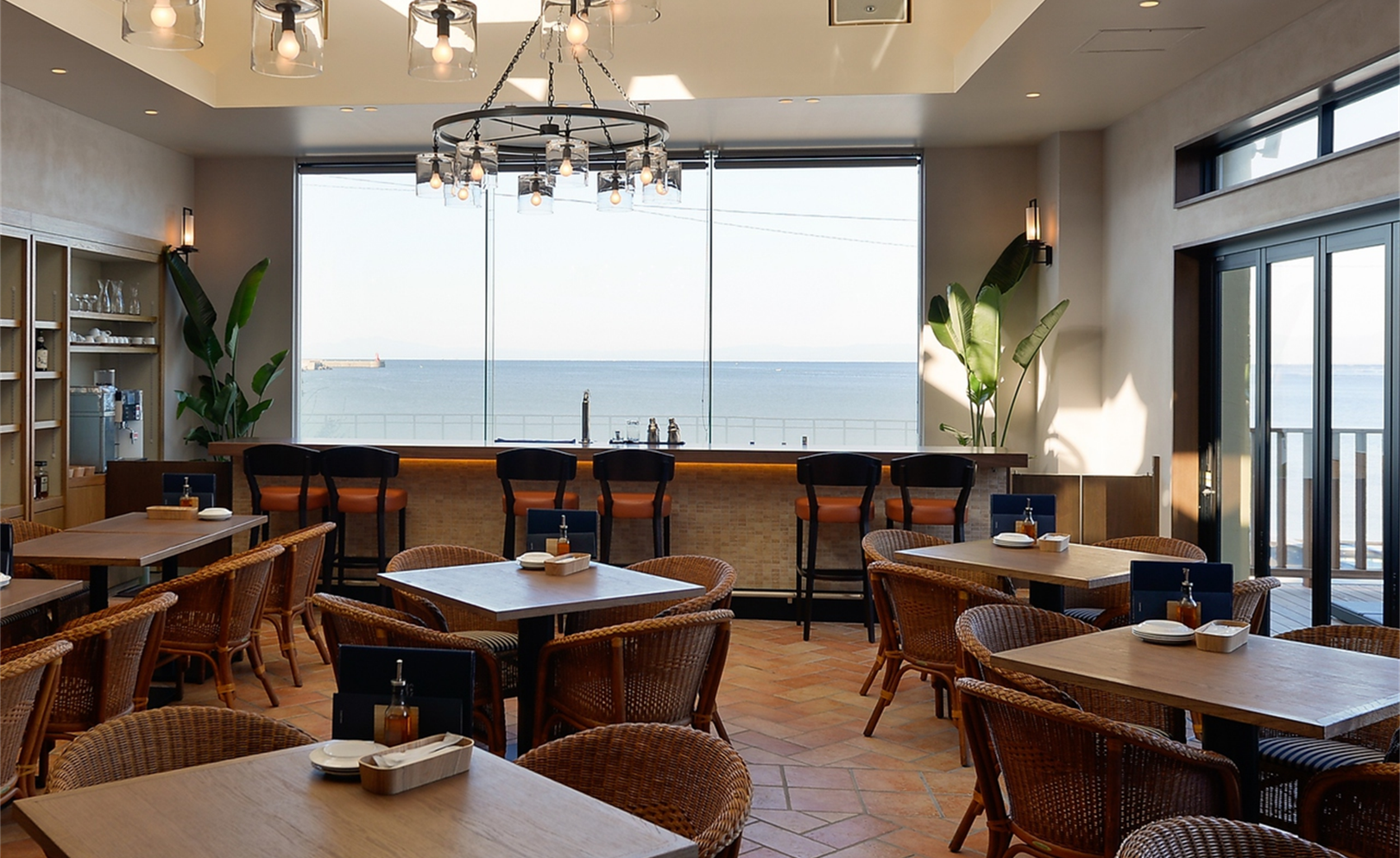 目の前に広がるのは逗子海岸と海。岬に囲まれた逗子の海がすべて視界に入るオーシャンビューです。席数はテラス席36席と、個室4部屋(24席)を含む全170席。テラス席からはロマンティックな夜景も望めます。カフェ利用から貸し切りパーティーまで様々なシーンでご利用いただけます。