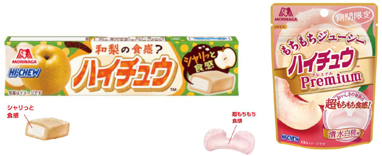 「ハイチュウプレミアム<清水白桃味>」では、フレッシュでジューシーな清水白桃の味わい、絶妙な柔らかさと噛み応えが織りなす 『超もちもち食感』をお楽しみいただけます。
