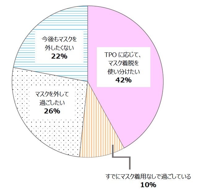 調査では、“今後のマスク着用”について、「TPOに応じて、マスク着脱を使い分けたい」と回答した人が最も多く「マスクを外して過ごしたい」が全体の26%、「今後もマスクを外したくない」が22%、「すでにマスク着用なしで過ごしている」が10%という結果となりました。
