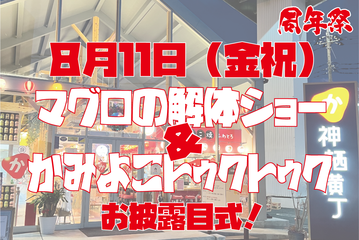 神栖横丁周年祭は今回が初開催!1周年記念イベントとして、マグロの解体ショーを開催!そしてかみよこトゥクトゥクの登場!と盛りだくさん!更に、神栖横丁公式LINEの登録で8月いっぱいは20%OFFの特別チケットもついてます!神栖横丁を沢山の方々に知って頂きたい!神栖横丁がこの地域にあってよかった!そんな方々が沢山増えることを願ってこの周年祭を開催します!