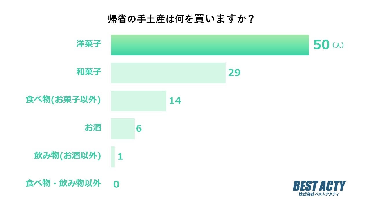 帰省の手土産は何を買うかについて100人にアンケートを行ったところ、「洋菓子」と回答する人が最も多い結果となりました。