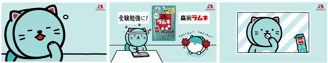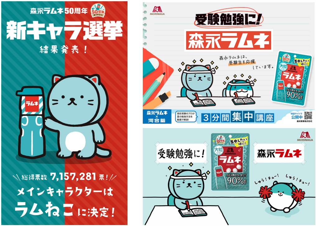 「新キャラ選挙」には、ラムネを食べると顔が集中するハムスター「しゅうチュー」と、ラムネを食べるとライオンのような姿になる猫「ラムねこ」が立候補しました。“森永ラムネのメインキャラクター”の座をかけた選挙の結果、「ラムねこ」が勝利しました。今後、「しゅうチュー」もサブキャラクターとして「ラムねこ」と一緒に活動します。