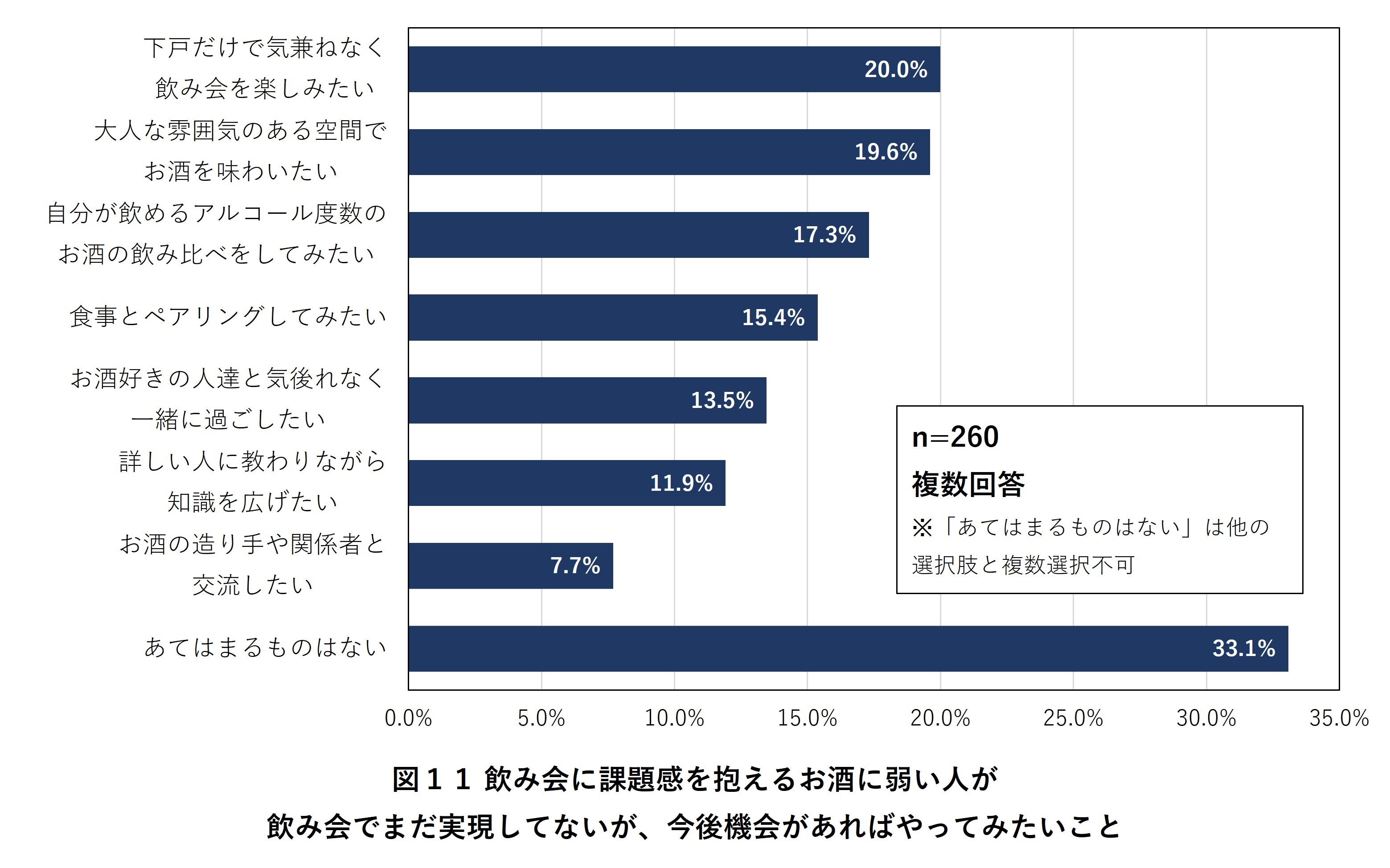 飲み会に課題感を抱えるお酒に弱い人に「飲み会でまだ実現してないが、今後機会があればやってみたいこと」を聞きました(複数回答)。「下戸だけで気兼ねなく飲み会をしてみたい(20.0%)」や「自分が飲めるアルコール度数のお酒の飲み比べをしてみたい(17.3%)」など、「お酒に弱い自分にフィットしたお酒体験」へのニーズが高いことが明らかになりました。また、「大人な雰囲気のある空間でお酒を味わいたい(19.6%)」「食事とペアリングしてみたい(15.4%)」といった「お酒ならではの体験」へのニーズも浮き彫りに(図11)。