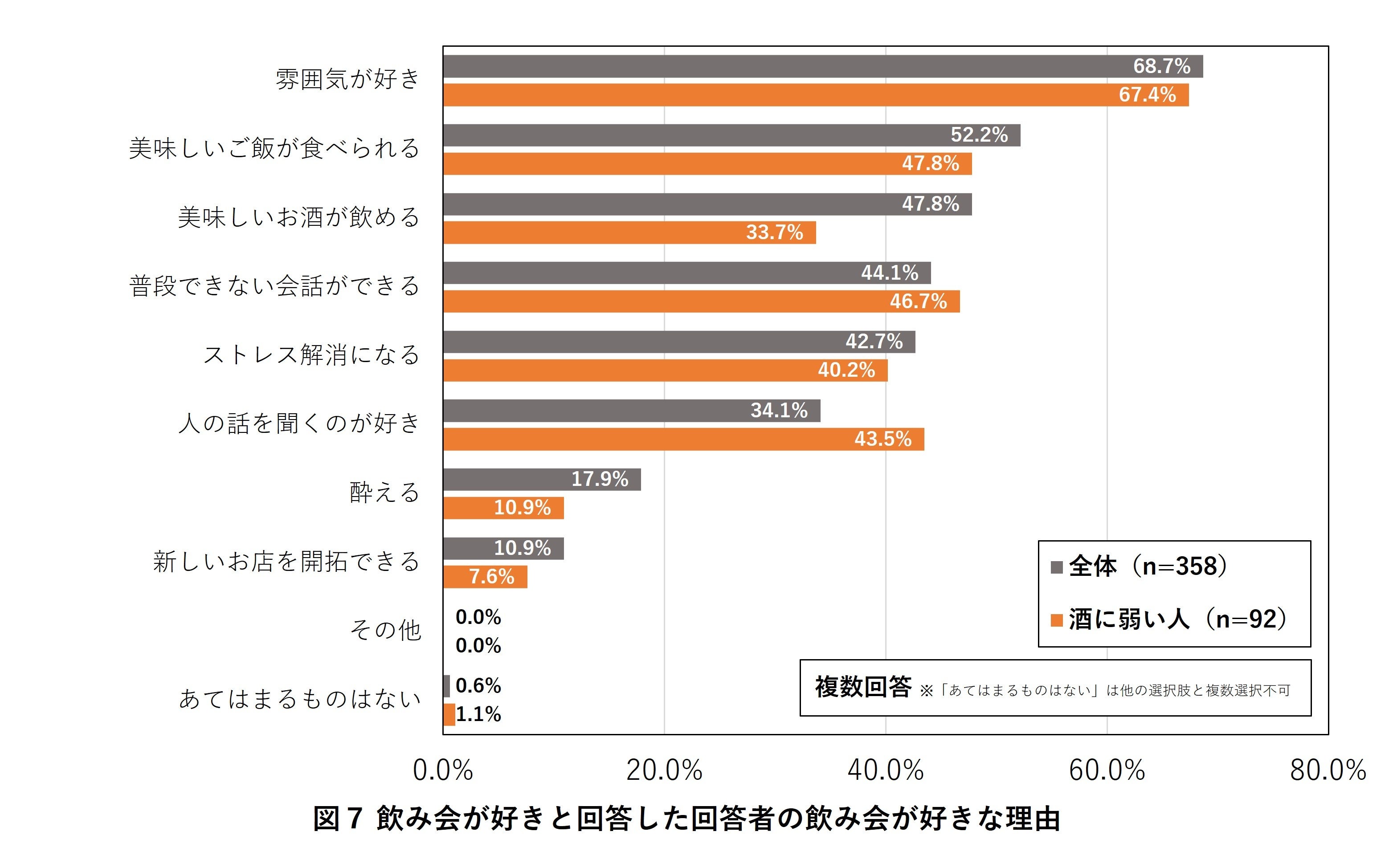 「飲み会が好き」な人にその理由を聞いたところ(複数回答)、全体の68.7%が「雰囲気が好き」と回答しました。また、お酒に弱い人に対象を絞ると、46.7%が「普段できない会話ができる」、43.5%が「人の話を聞くのが好き」などが全体を上回る回答に。飲み会のコミュニケーション面に特に魅力を感じていることが伺える一方、「美味しいお酒が飲める(33.7%)」、「美味しいご飯が食べられる(47.8%)」などは全体に比べて低いことから、飲食面での楽しみは相対的に低いことが分かりました(図7)。