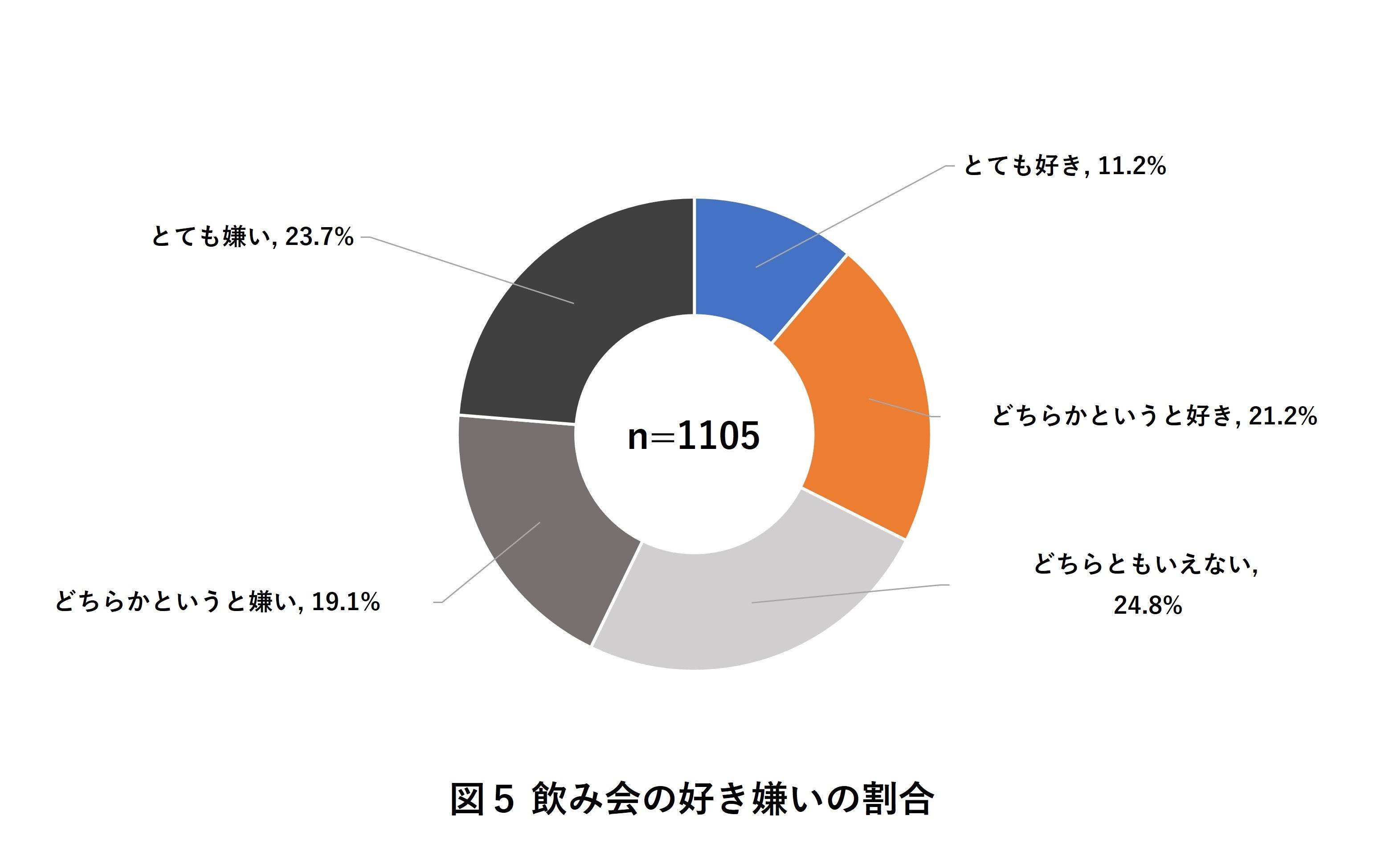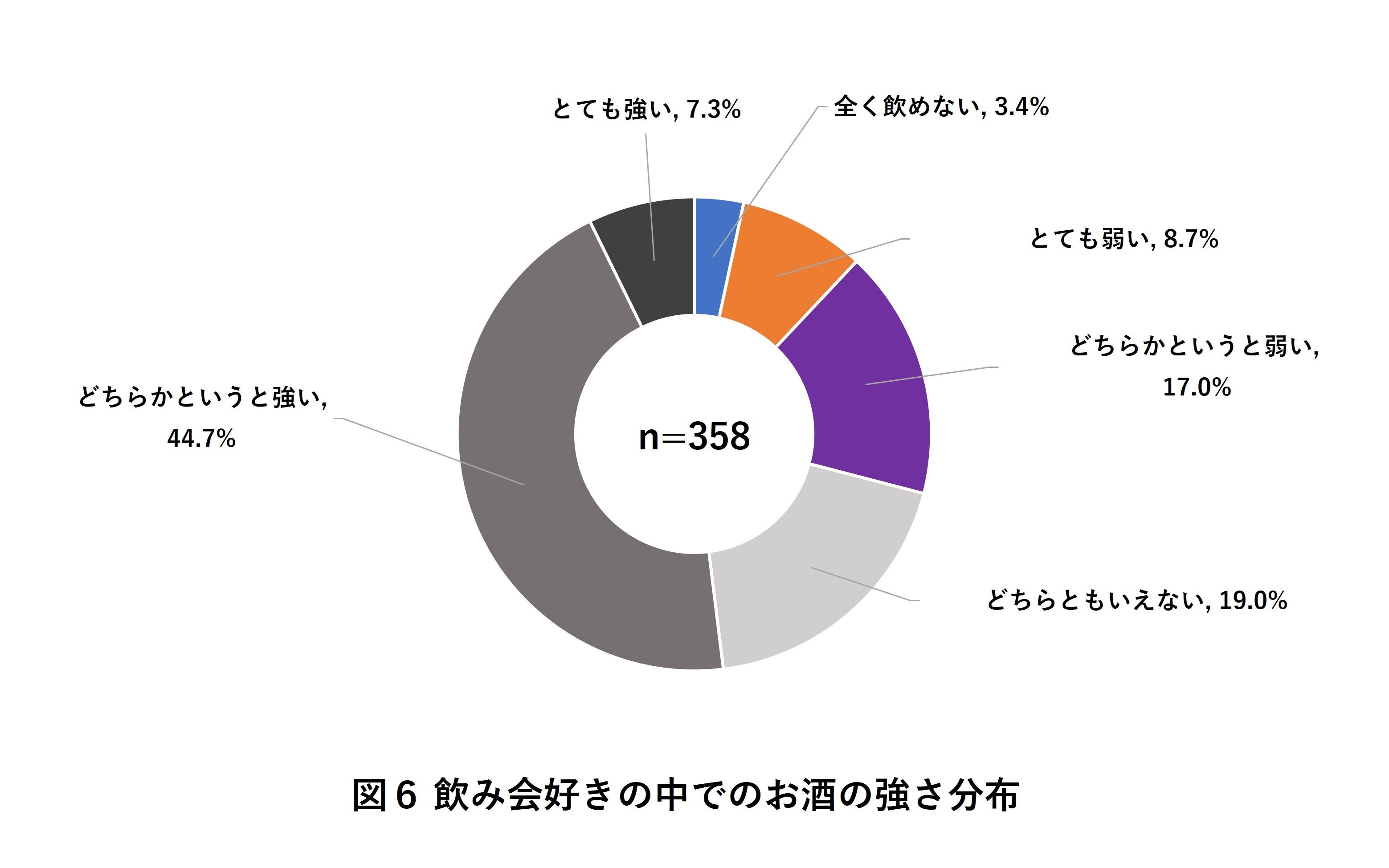 自宅以外の利用シーンとして「飲み会」の実態についても調査したところ、全体の32.4%が「飲み会が好き」と答えました(図5)。「飲み会が好き」と回答した回答者を「お酒の強さ」ごとに分類すると、飲み会好きのうち29.1%が「お酒に弱い/全く飲めない」人だということが分かりました(図6)。