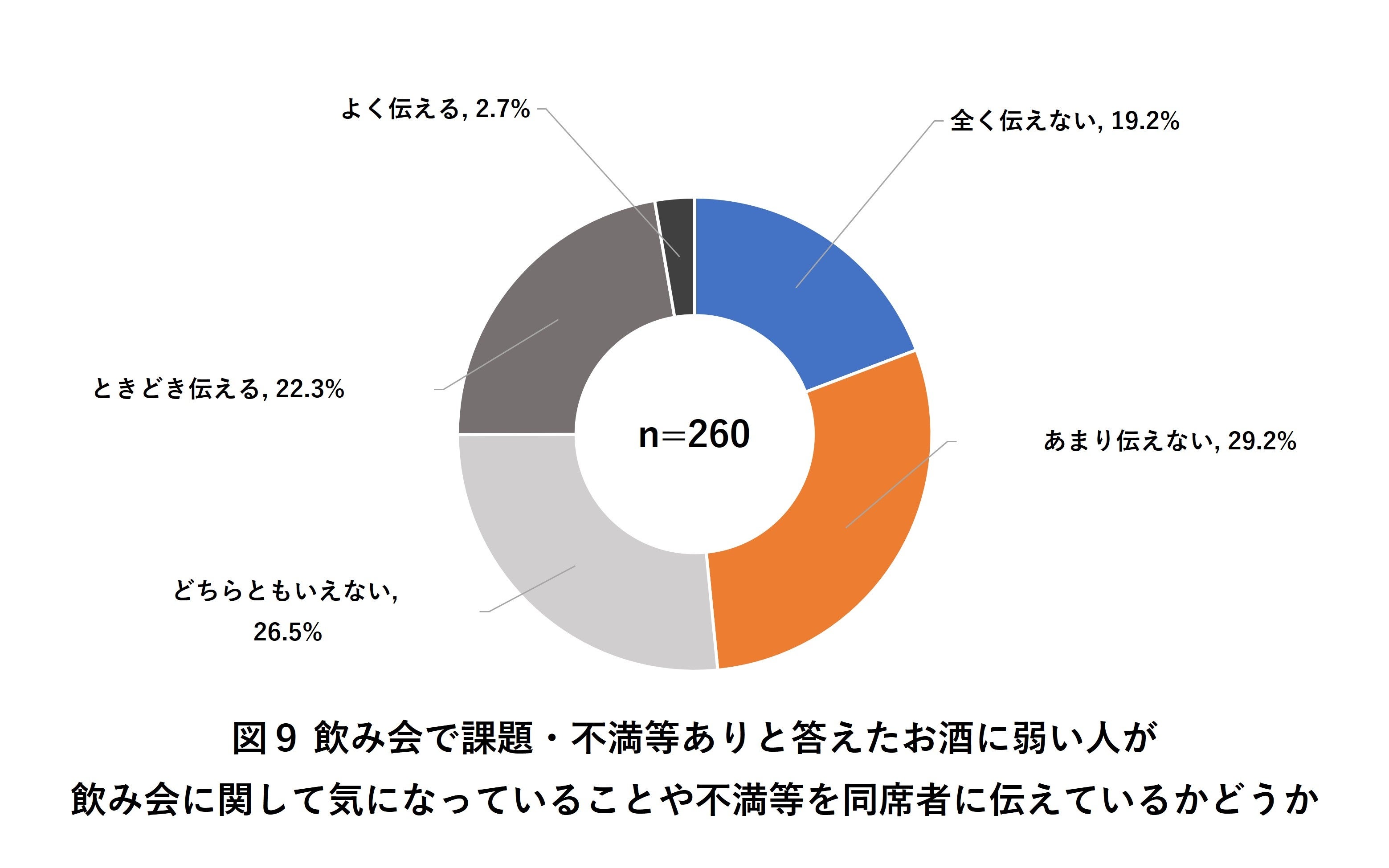 飲み会で課題・不満等ありと答えたお酒に弱い人に、課題・不満をその場の人たちに伝えているかを聞いたところ、48.4%が「伝えない」と回答(図9)。
