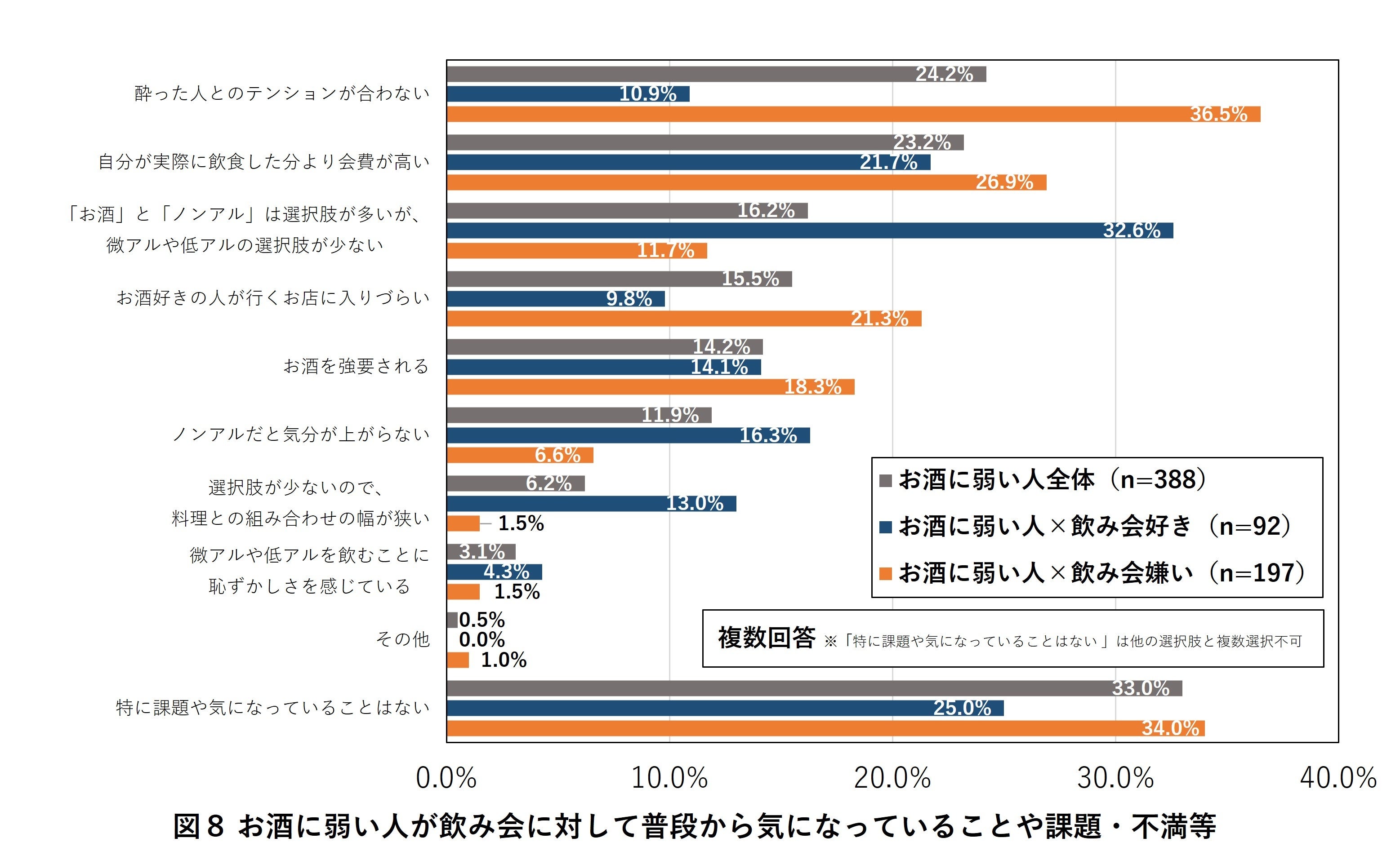 お酒に弱い人たちに、飲み会に感じている課題・不満等を聞いたところ(複数回答)、全体の67.0%が具体的な課題・不満について回答。また、「お酒に弱い飲み会好き」の32.6%が「『お酒』と『ノンアル』は選択肢が多いが、微アルや低アルの選択肢が少ない」、13.0%が「選択肢が少ないので、料理との組み合わせの幅が狭い」、16.3%が「ノンアルだと気分が上がらない」と答え、いずれも全体を上回りました。微アル・低アルビールの選択肢の少なさや、アルコールを飲んだ気分になれないことが飲み会の満足度を下げていることが想定されます。また、「お酒に弱い飲み会嫌い」な人は、「酔った人とのテンションが合わない(36.5%)」、「自分が実際に飲食した分より会費が高い(26.9%)」などが全体を上回り、飲み会にありがちなシチュエーションにマイナスの感情を抱いていることが伺えます(図8)。