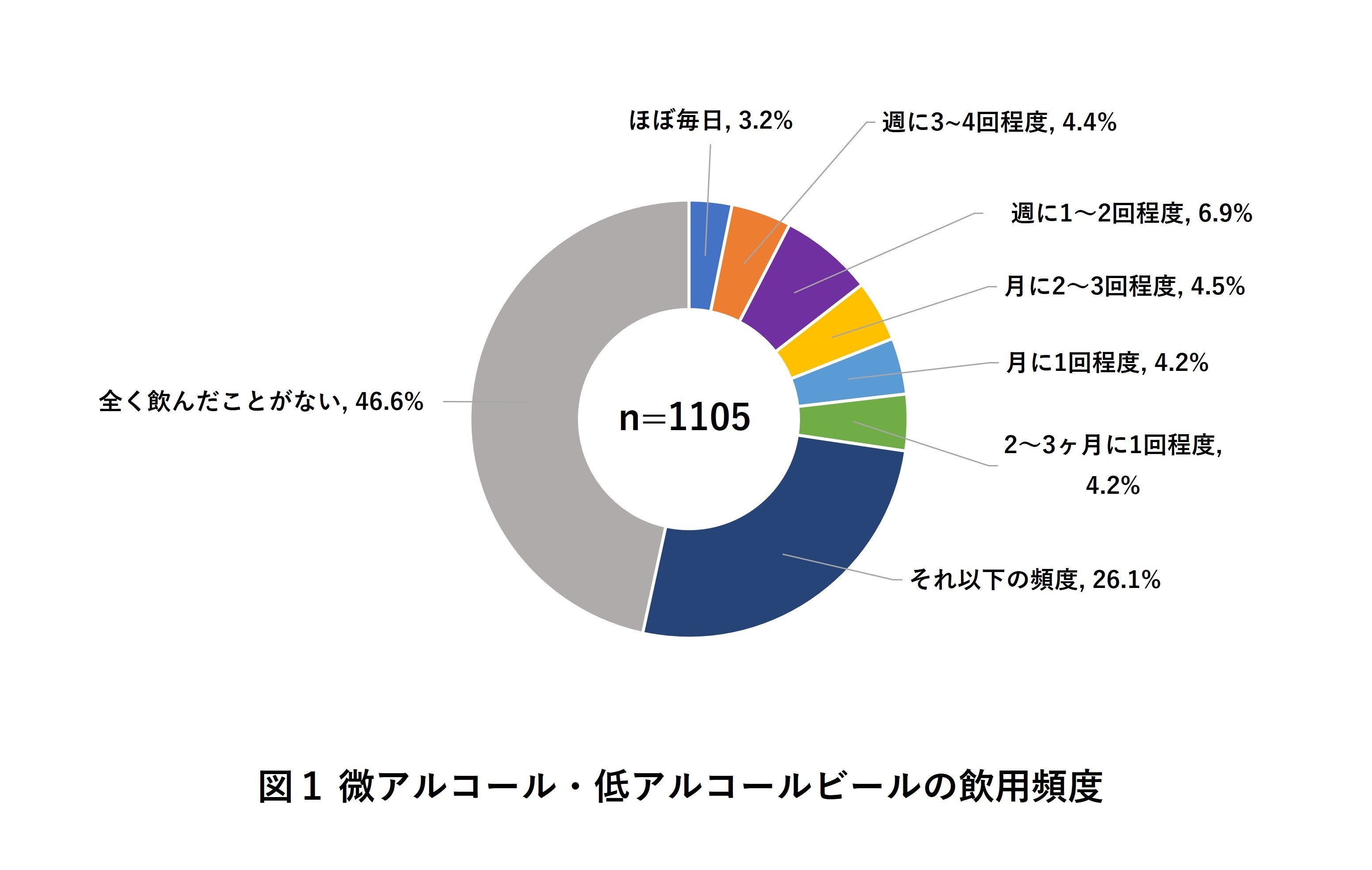 微アル・低アルビールの飲用頻度を聞いたところ、全体の53.4%が一度でも微アル・低アルビールを飲用したことがあり、14.5%が週1回以上の頻度で習慣的に微アル・低アルビールを飲用していることが明らかになりました(図1)