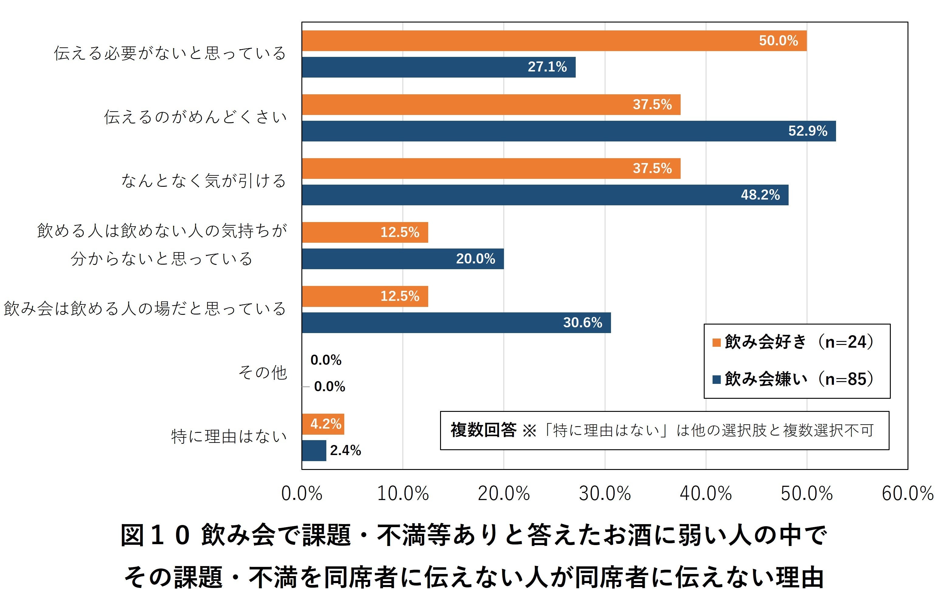 そのうち、「飲み会好き」に対象を絞ると、「伝える必要がないと思っている(50.0%)」が特に多く見られました。一方、「飲み会嫌い」に絞ると、「伝えるのがめんどくさい(52.9%)」、「なんとなく気が引ける(48.2%)」、「飲み会は飲める人の場だと思っている(30.6%)」などが顕著に。「飲み会好き」がある意味割り切って楽しもうとしているのに対し、「飲み会嫌い」は酒が好きであることが前提の集まりに対する遠慮やあきらめのトーンも伺える結果になりました(図10)。