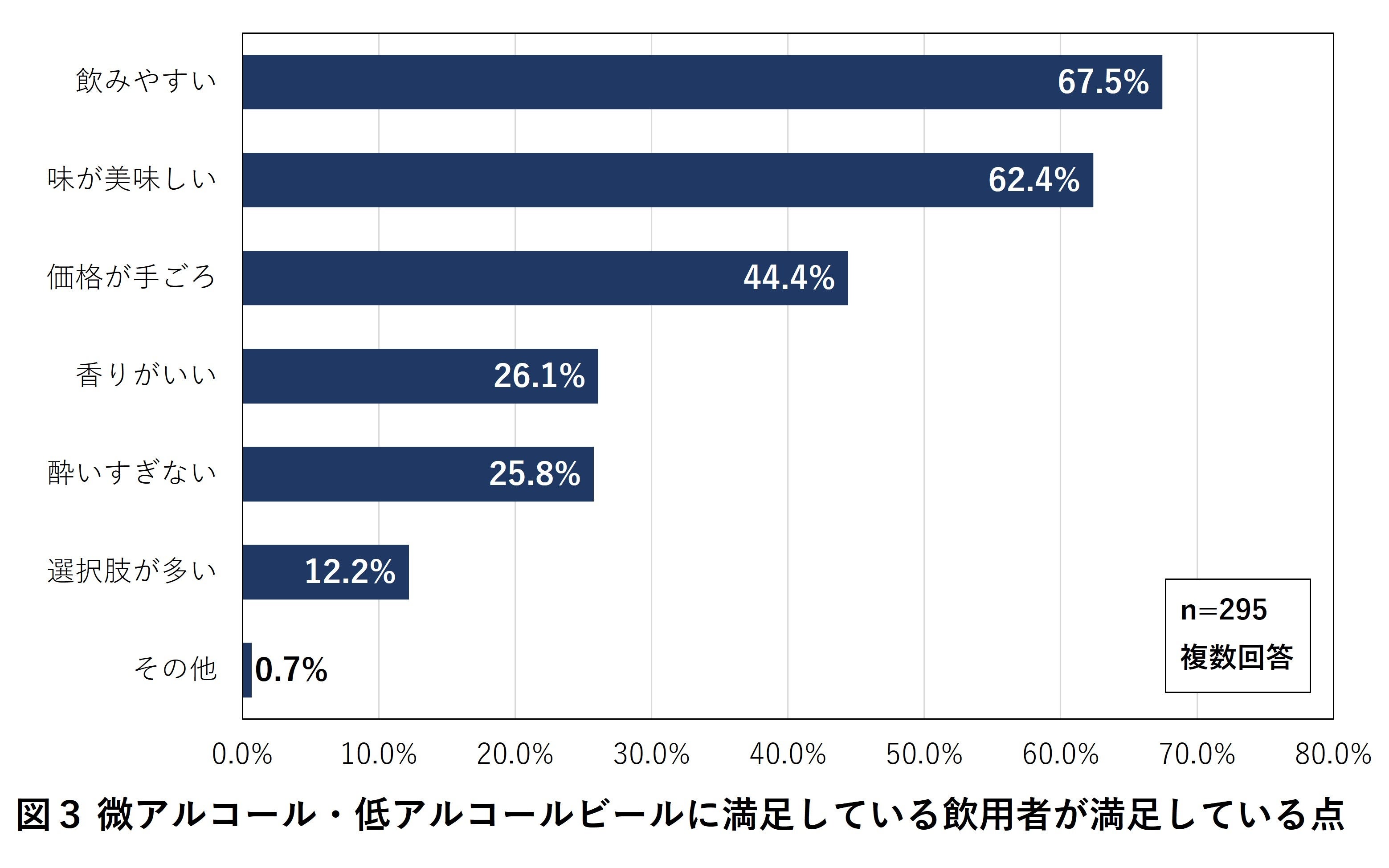 微アル・低アルビールに満足している飲用者に、微アル・低アルビールについて満足している理由を聞いたところ(複数回答)、67.5%が「飲みやすい」、62.4%が「味が美味しい」と回答しました。微アル・低アルビールの機能的価値について、一定の満足感を得ている飲用者の割合が高いことが伺えます(図3)。