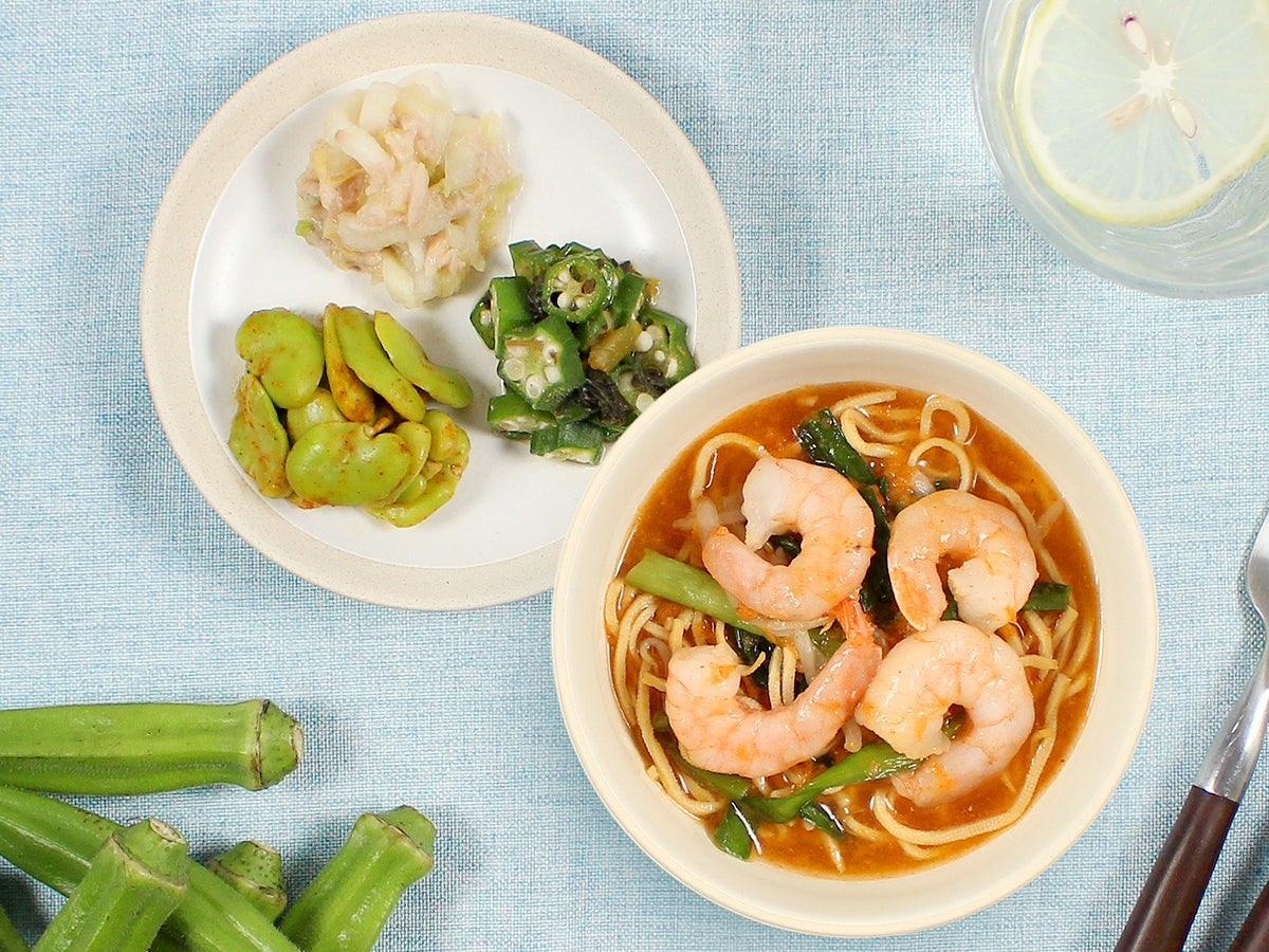 副菜は、そら豆のカレー風味、ツナの入った白菜サラダ、高菜入りのオクラのバジルソースです。