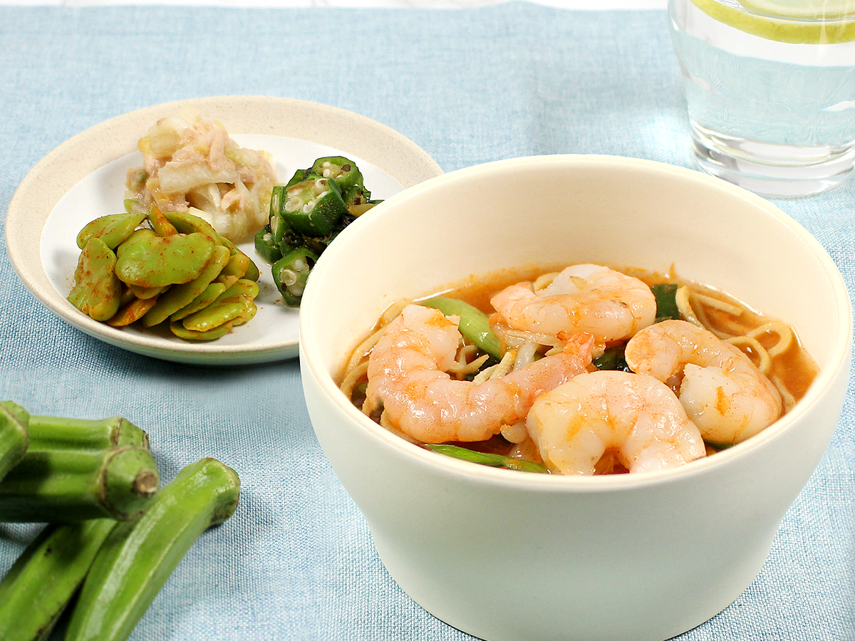 ラクサとは東南アジアで日常的に食されている料理で、ココナッツミルクの甘さ、甲殻類の出汁、香辛料をきかせた、コクのあるスパイシー感が特徴のスープ麺です。ナッシュでは、豆腐干を麺に見立てて仕上げました。具材にはもやし、ニラ、エビを使用しております。