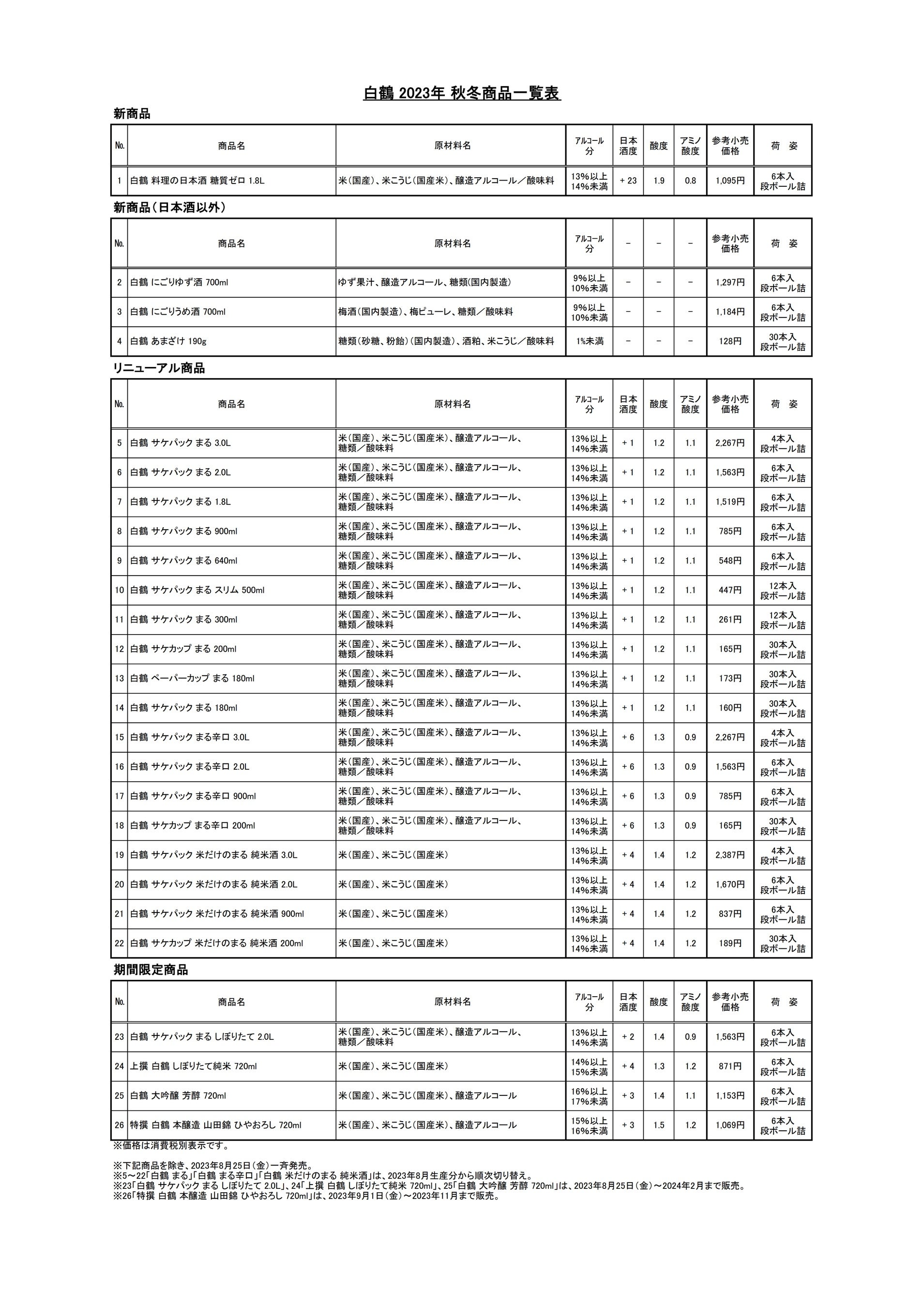 詳細は「白鶴 2023年 秋冬商品一覧表」をご覧ください。
