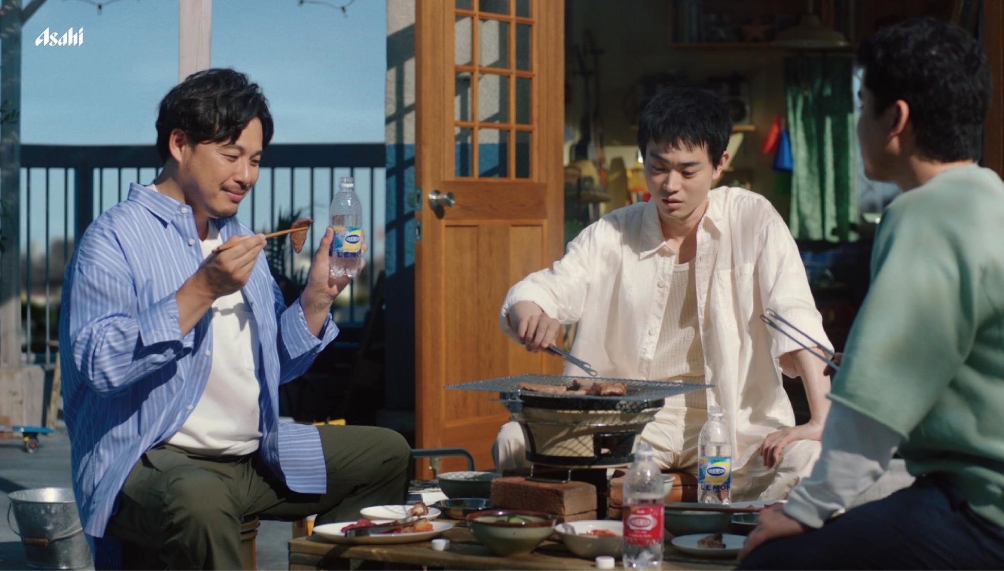 昼下がりの自宅の屋上で、仲間と焼肉を楽しむ菅田さんと平子さんがテーブルに置かれた七輪の上で焼肉を楽しむシーンから始まります。菅田さんは焼肉と一緒に『ウィルキンソン タンサン レモン』を手に取り、一口飲み、すぐさまお肉を口に運びます。『ウィルキンソン タンサン レモン』の炭酸の刺激が食欲を刺激した様子で、幸せそうな表情を浮かべています。そんな様子を見ていた平子さんは『ウィルキンソン タンサン レモン』とお肉を両手に持ち、愛おしそうな表情で「君たち、お似合いだね。」と、キザなセリフを漏らし、菅田さんに冷静なツッコミをいれられます。
