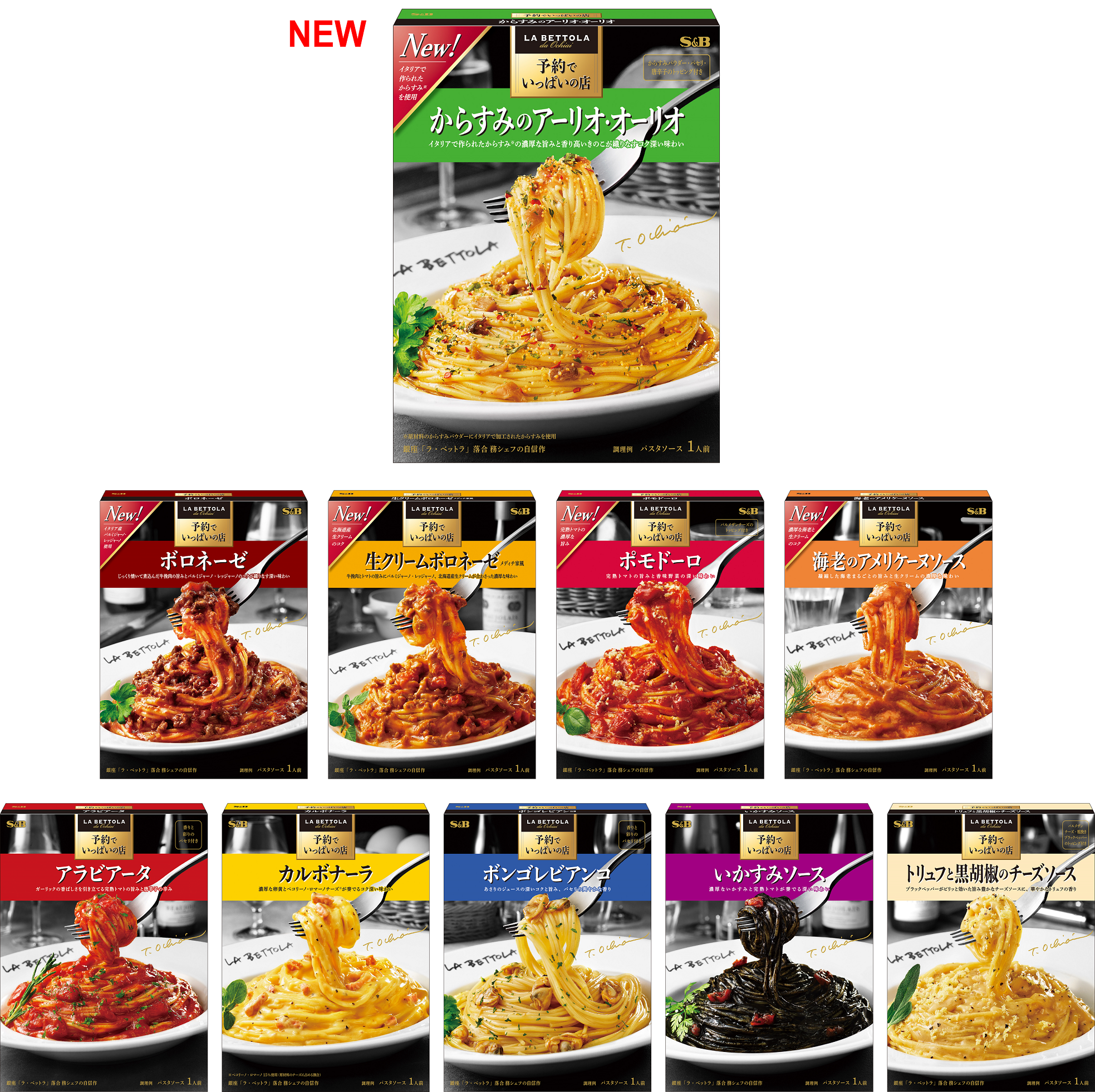いつも予約でいっぱいのイタリアンとして人気の東京・銀座「ラ・ベットラ」オーナーシェフ、落合務 シェフの味づくりを忠実に再現。ご自宅にいながら「ラ・ベットラ」の世界感を存分にお楽しみいただけるパスタソースシリーズです。