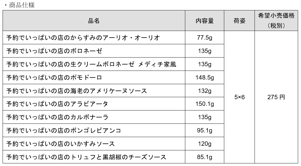 ※「アラビアータ」「カルボナーラ」「ボンゴレビアンコ」「いかすみソース」「トリュフと黒胡椒のチーズソース」は、パッケージリフレッシュのみ。