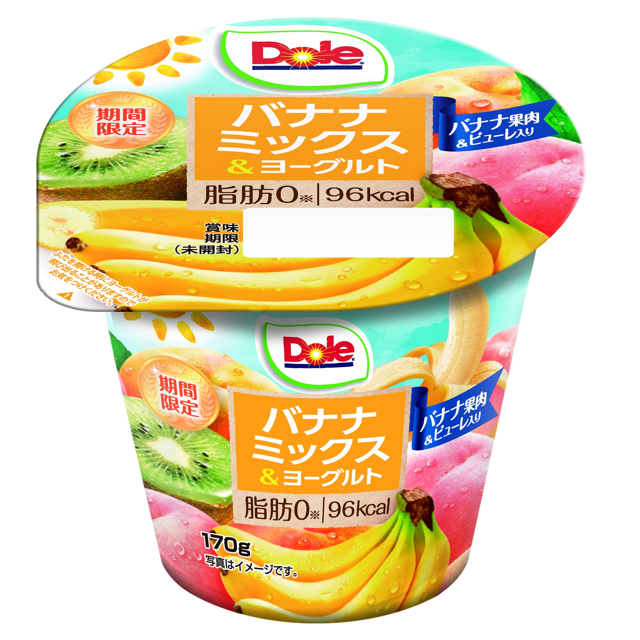 脂肪0※ヨーグルト使用で、まるごと食べても100kcal以下のヘルシーなヨーグルトであるため、日々の朝食替わりやお食事後のデザートはもちろん、夜食にも罪悪感なく、手軽においしくフルーツとヨーグルトが摂取できます。暑い夏にぴったりの「Dole®バナナミックス&ヨーグルト」を、ぜひお楽しみください。