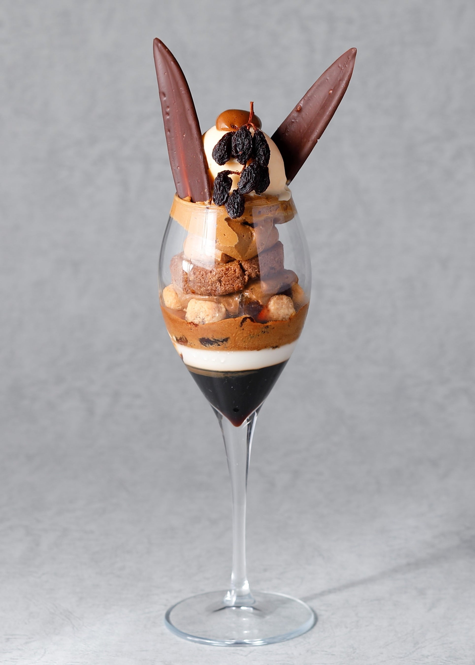 コーヒーのシブーストでグラスに蓋をし、その上に自家製のミルクアイスとチョコレート、レーズンをトッピング。コーヒーとミルクアイスの相性は抜群で、シンプルながらも奥深い味わいです。