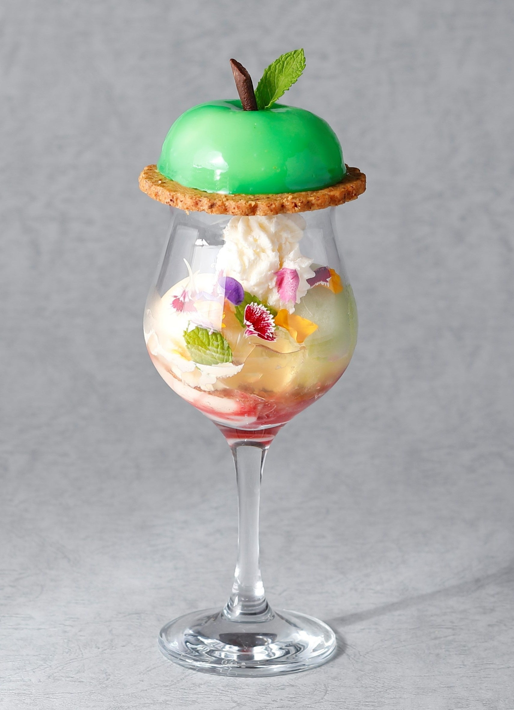 パフェ全体の美味しさを引き立てる、ヨーグルトの爽やかな酸味とショコラブランが奏でる上品な甘味。赤色のソースはグロゼイユといちご、ラズベリーのピューレをブレンドし、甘酸っぱい味わいに仕上げています。グラスの中にはエルダーフラワーゼリー、バニラアイスクリーム、青りんごシャーベット、りんごゼリー、生クリームなど、青りんごと相性の良い食材を組み合わせました。