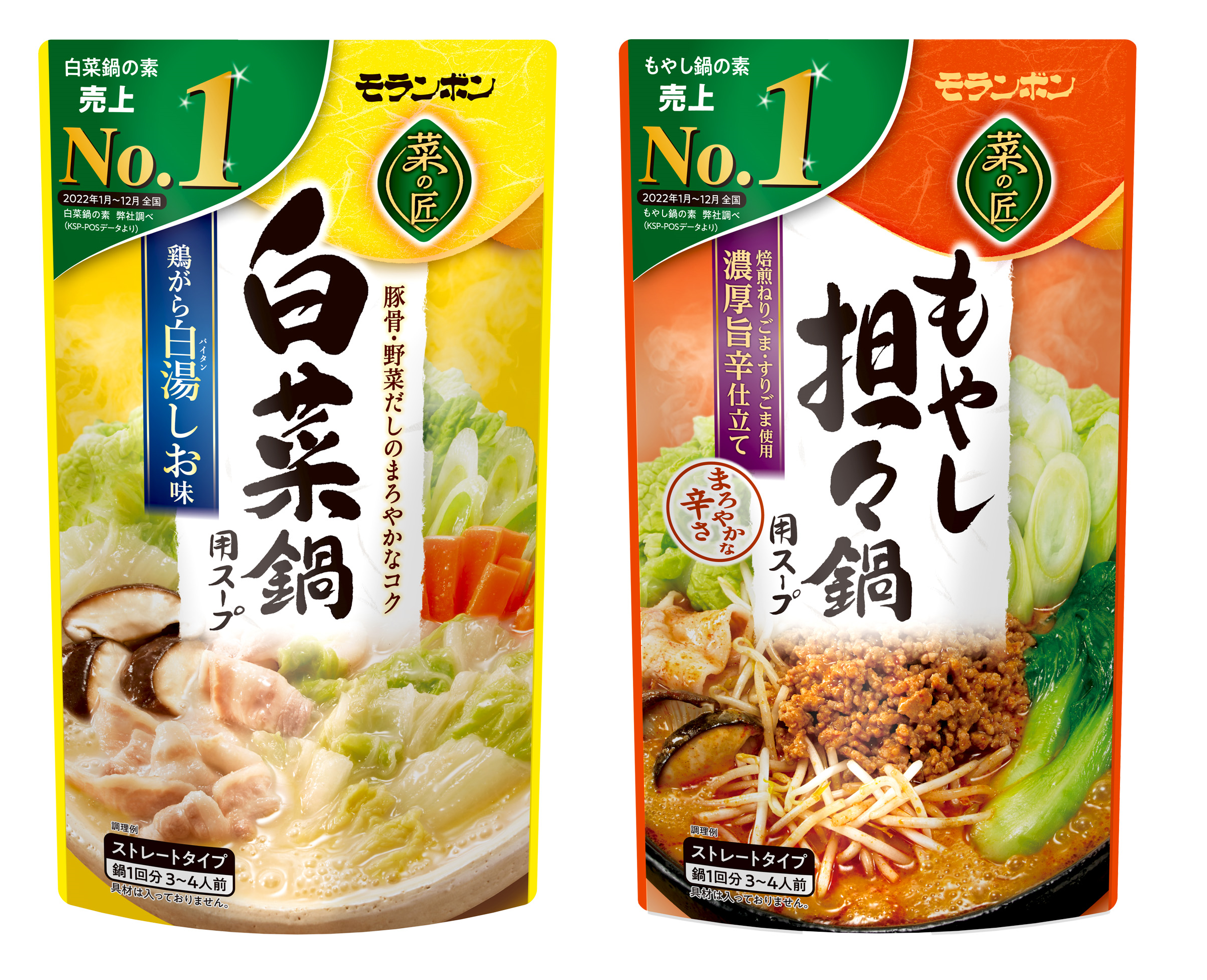 青果売場向けの鍋用調味料は野菜素材がメインとなる鍋(白菜鍋のような)カテゴリーが多く、なかでも白菜鍋やもやし鍋で約7割を占めています。この市場を牽引する白菜鍋、もやし鍋カテゴリーにおいて自社の「菜の匠シリーズ」内「白菜鍋用スープ」「もやし担々鍋用スープ」が売上No.1と支持をいただきました(KSP-POS 全店千人金額(全国) 22年 1-12月)。そこでさらに「菜の匠シリーズ」の魅力を知っていただくことで、より多くの方に野菜がおいしく食べられる鍋として楽しんでいただけるよう、「菜の匠 白菜鍋用スープ」「菜の匠 もやし担々鍋用スープ」の2品をリニューアルします。
