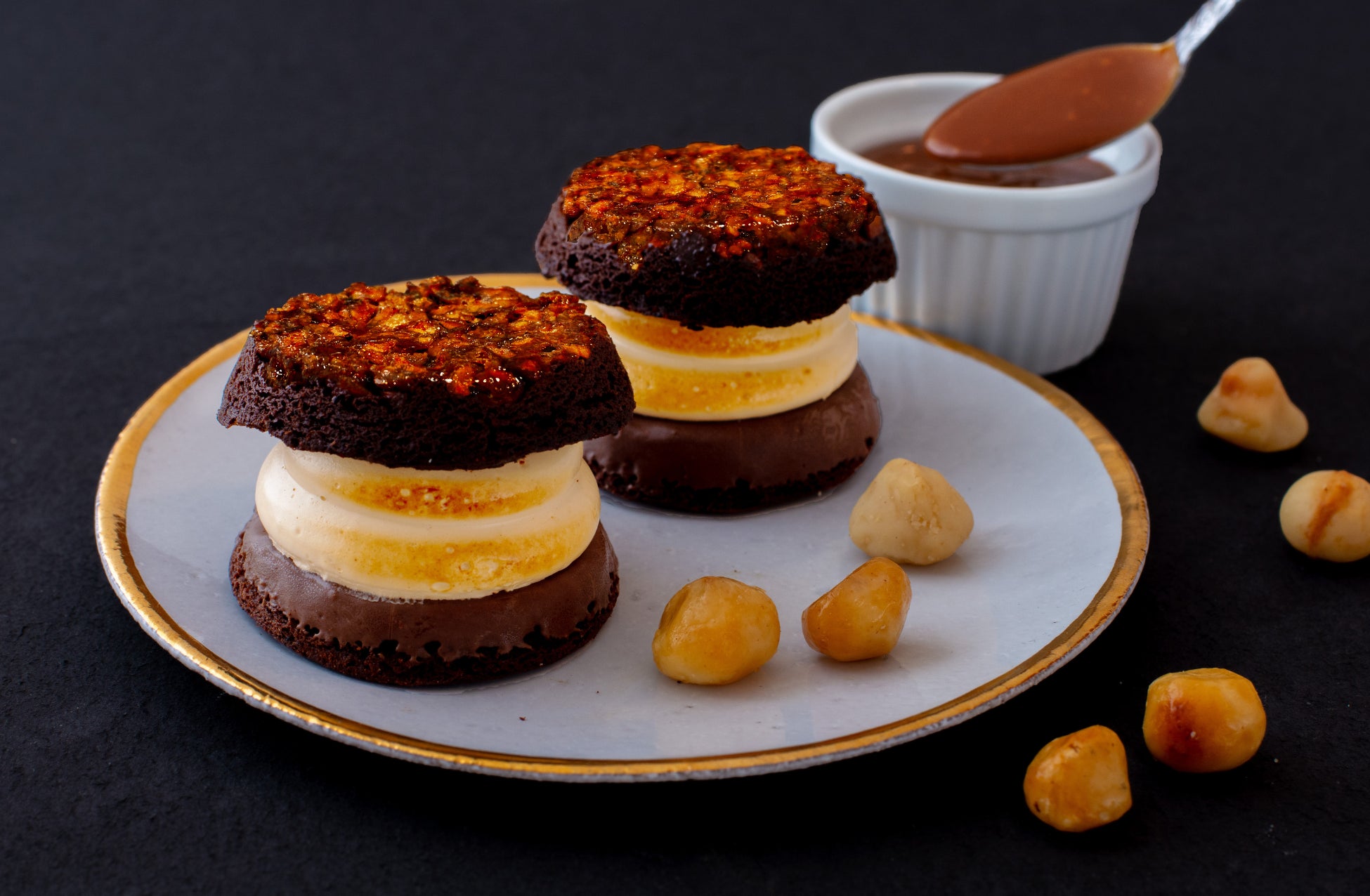 香ばしいマカダミアナッツのキャラメリゼ、ビターなチョコレートブラウニー、ふわふわのマシュマロキャラメル、そしてローストされたマカダミアナッツのコク深くまろやかなマカダミアソース。