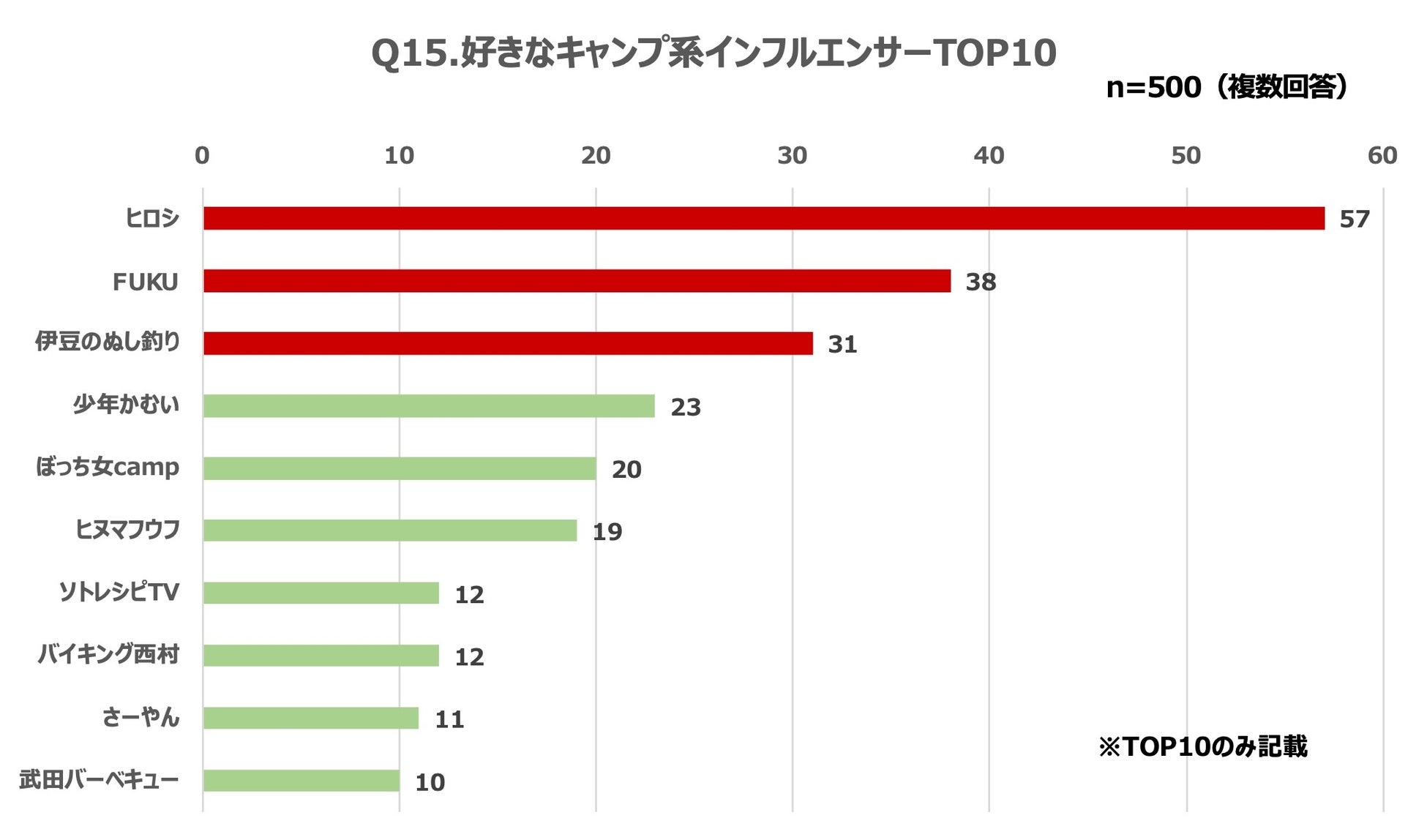 また好きなキャンプ系インフルエンサーを調査したところ、1位はキャンプ芸人としてもお馴染みの「ヒロシさん」、2位はキャンプ系YouTuber「FUKUさん」、3位もキャンプ系YouTuber「伊豆のぬし釣りさん」がランクインしました。YouTubeを情報の収集源にしている方が多いことから、YouTubeのチャンネル登録者数が多い方に票が集まったように見受けられます。
