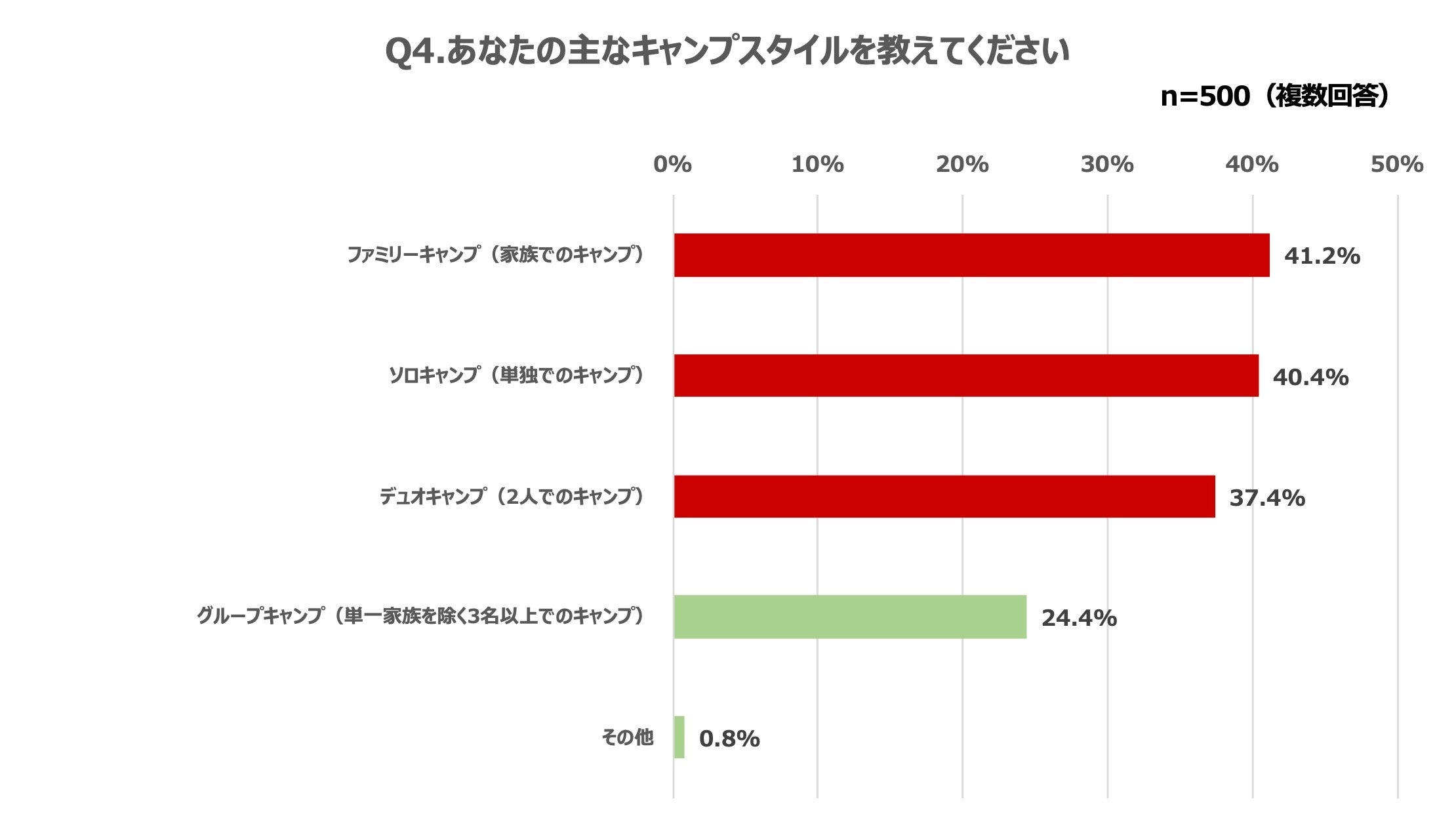 さらに、「主なキャンプスタイル」について尋ねたところ、「ファミリーキャンプ(家族でのキャンプ)」が41.2%、「ソロキャンプ(単独でのキャンプ)」が40.4%、「デュオキャンプ(2人でのキャンプ)」が37.4%と、自身に合ったキャンプスタイルでキャンプを楽しんでいることが伺えます。