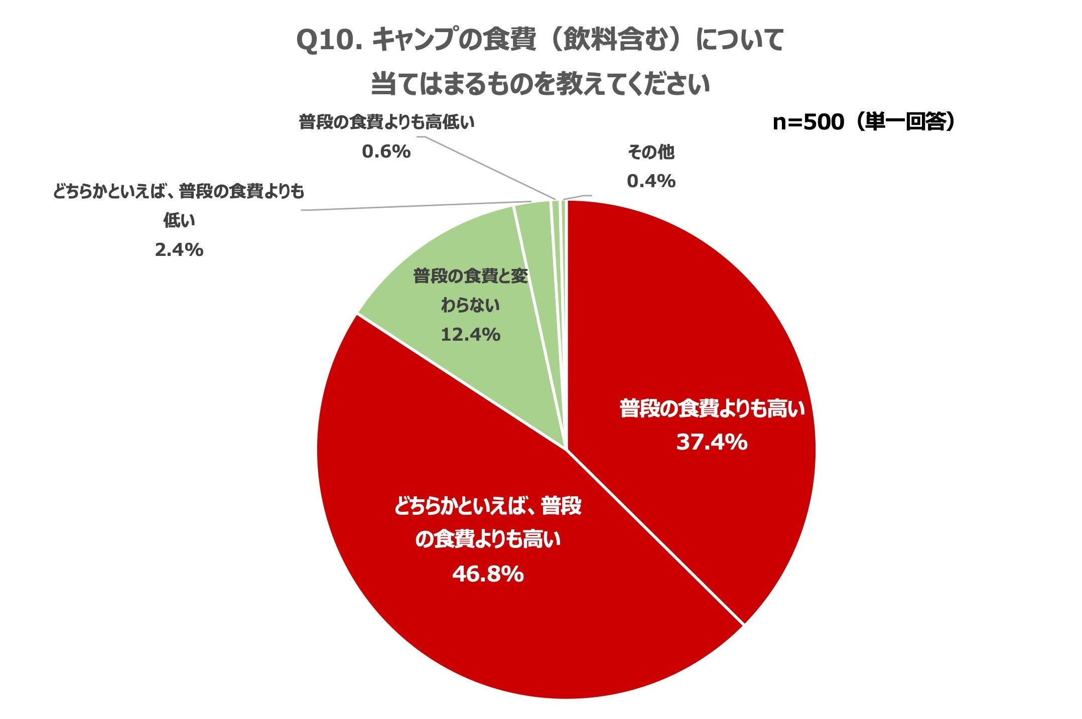 「キャンプの食費について」尋ねたところ「普段の食費よりも高い」が37.4%、「どちらかといえば、普段の食費よりも高い」が46.8%という回答になり、約85%の人が普段よりも高い食費を払うということが明らかになりました。