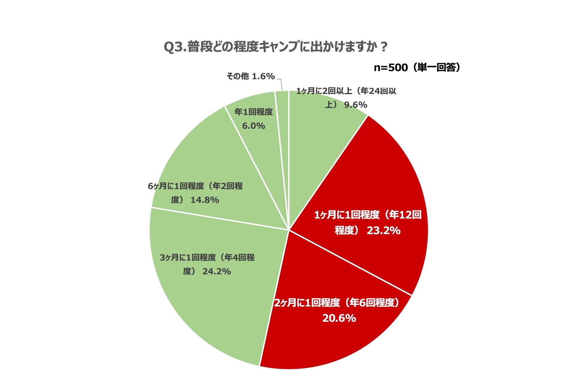 また、「キャンプに行く頻度」について尋ねたところ、「1ヶ月に1回程度(年12回程度)」と回答した人が23.2%と最も多く、次に「2ヶ月に1回(年6回程度)」という回答が20.6%続き、約4割が、年に6~12回程度キャンプを楽しんでいることが明らかになりました。割合に変化は見られましたが昨年実施した『ソトレシピ総研「キャンプトレンド調査2022」(https://sotorecipe.com/magazines/souken-4)』と同様の回答が見られ、キャンプへの熱量が衰えていないことが伺えます。