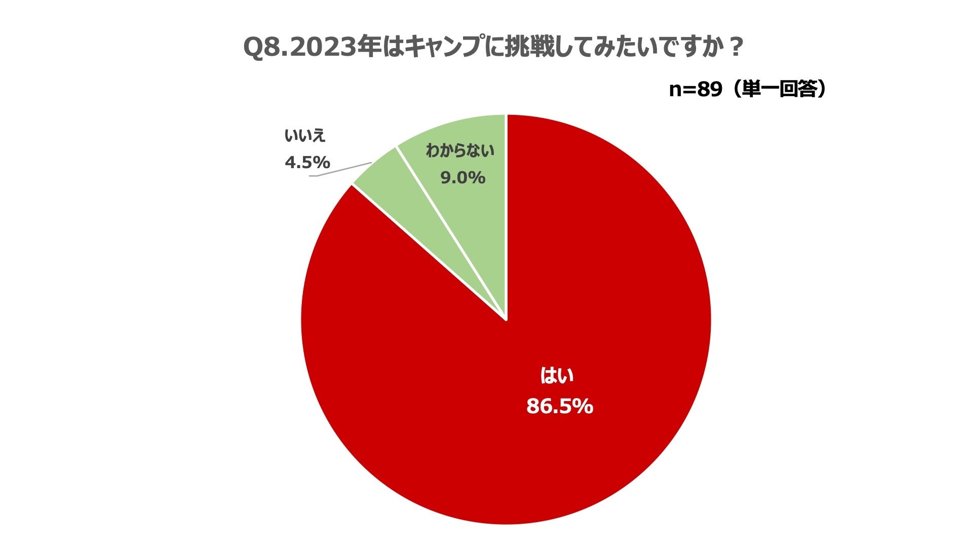 「コロナ禍に比べて、新型コロナ5類分類後キャンプに行く回数」については、「増やしたい」が最も多い31.2%、次に「どちらかと言えば増やした」が19.2%と回答し、またQ1の質問で2022年にキャンプに行っていないと回答した方に、「2023年はキャンプに挑戦してみたいですか?」と尋ねたところ、86.5%もの方が「はい」と答え、2023年はキャンプ市場がより活性化する可能性が見られました。