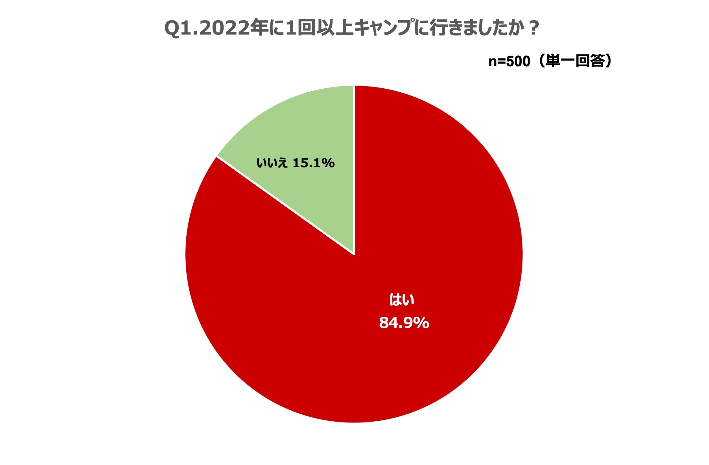 今回対象の589人に「2022年に1回以上キャンプに行きましたか?」と尋ねたところ、「はい」が84.9%、「いいえ」が15.1%となり、多くの人が2022年にキャンプを楽しんだことがわかりました。以降の設問では、「はい」と回答した500人を対象に質問し、一部設問のみ「いいえ」と回答した89人を対象に質問しています。