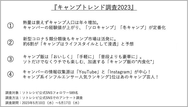 今回の着目すべきトピックは「ソロキャンプの定番化」、「冬キャンプ体験者の増加」、「ライフスタイルへの定着」です。