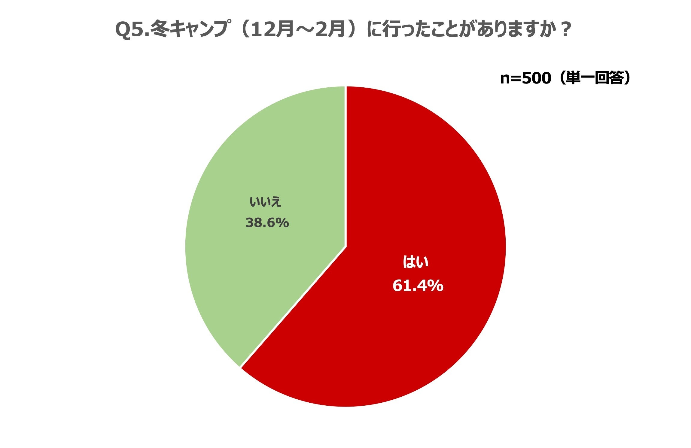また「冬キャンプに行ったことがありますか?」と尋ねたところ。61.4%が「はい」と回答し、3人に2人が冬キャンプ経験者ということがわかりました。