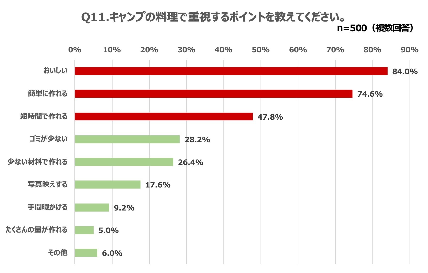 また「キャンプの料理で重視するポイントを」尋ねたところ「おいしい」が84.4%、「簡単に作れる」が74.6%、「短時間で作れる」が47.8%となり、キャンプ飯は普段よりも贅沢に、おいしく、手軽に楽しむ方が多いことがわかりました。