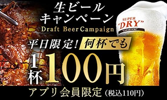 内容 :アサヒスーパードライ 中ジョッキ550円(税込605円)が、何杯でも1杯につき100円(税込110円)