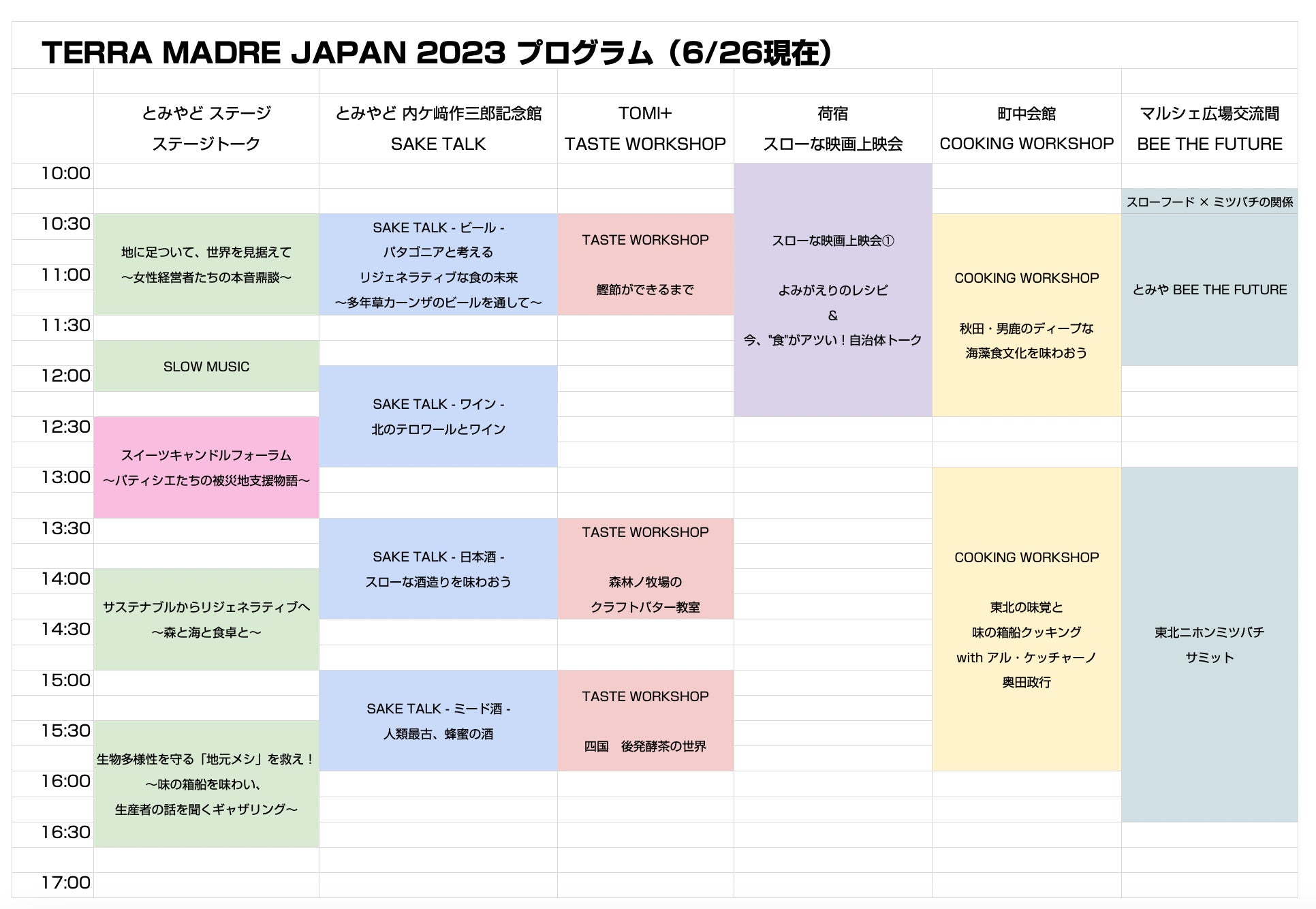 TERRA MADRE JAPAN 2023では、様々な魅力的なプログラムが盛りだくさん!ステージでのトークプログラムやお酒にまつわる卓話会「SAKE TALK」、五感を使って食を学ぶ「TASTE WORKSHOP」や「COOKING WORKSHOP」、スローな映画上映会、「BEE THE FUTURE」などをご用意しています。
