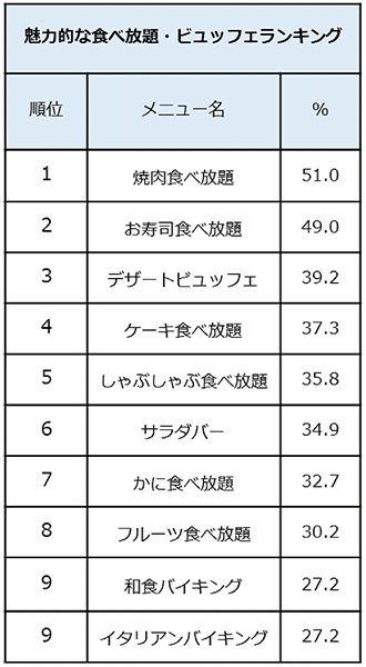■魅力的な食べ放題・ビュッフェランキング1位は「焼肉」