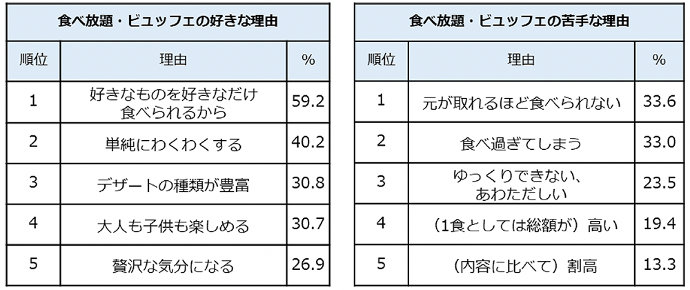食べ放題・ビュッフェの好きな理由としては「好きなものを好きなだけ食べられるから」(59.2%)が1位でした。2位には「単純にわくわくする」(40.2%)が入り、期待感の高さがうかがえます。一方で苦手な理由としては、「元が取れるほど食べられない」(33.6%)や「(1食としては総額が)高い」(19.4%)、「(内容に比べて)割高」(13.3%)といったコストパフォーマンスに関するものが挙がりました。
