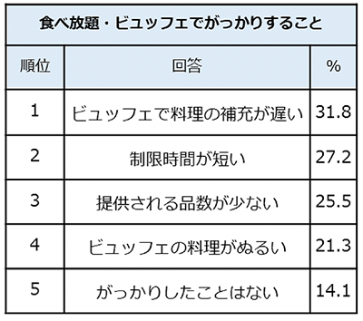 「食べ放題・ビュッフェでがっかりしたこと」について、最も多かったのは「ビュッフェで料理の補充が遅い」(31.8%)という声でした。2位には「制限時間が短い」(27.2%)が入り、1位同様「食べ放題なのに思い切り食べられない」ということががっかりするポイントのようです。一方で5位には「がっかりしたことはない」(14.1%)が入っており、食べ放題・ビュッフェ全体の満足度は高いことがうかがえます。