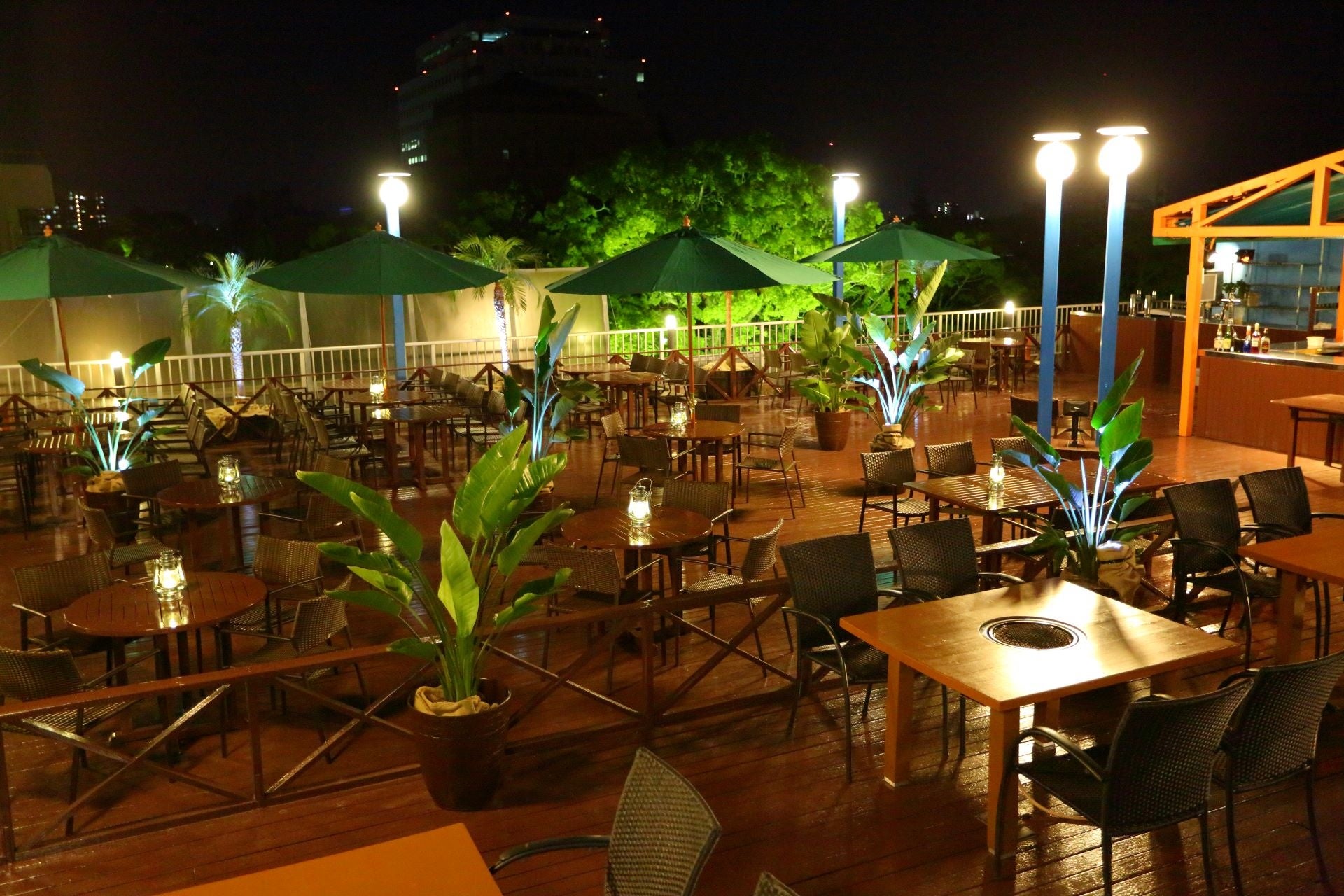 佐賀城のお濠と緑を眺めながら、星空の下オープンエアーのビアテラス。夏休みの思い出づくりにもいかがですか?