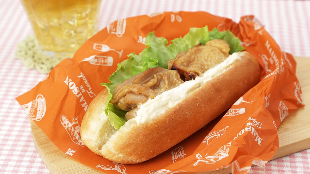 リーフレタスのみずみずしさと、自家製の大きな照焼チキンが2個、ドン!ドン!と入って、マヨネーズを絞りました。甘辛い照焼ソースの味とマヨネーズの相性が抜群です。