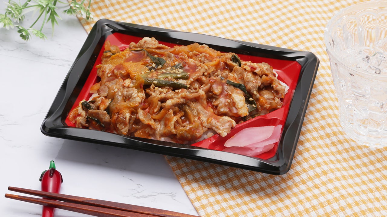 にんにくと赤唐辛子にコチュジャン・豆板醤のコクを加え、紹興酒で風味よく仕上げた「旨辛醤」を使って炒めた豚キムチをご飯の上にたっぷりのせたスタミナメニューです。