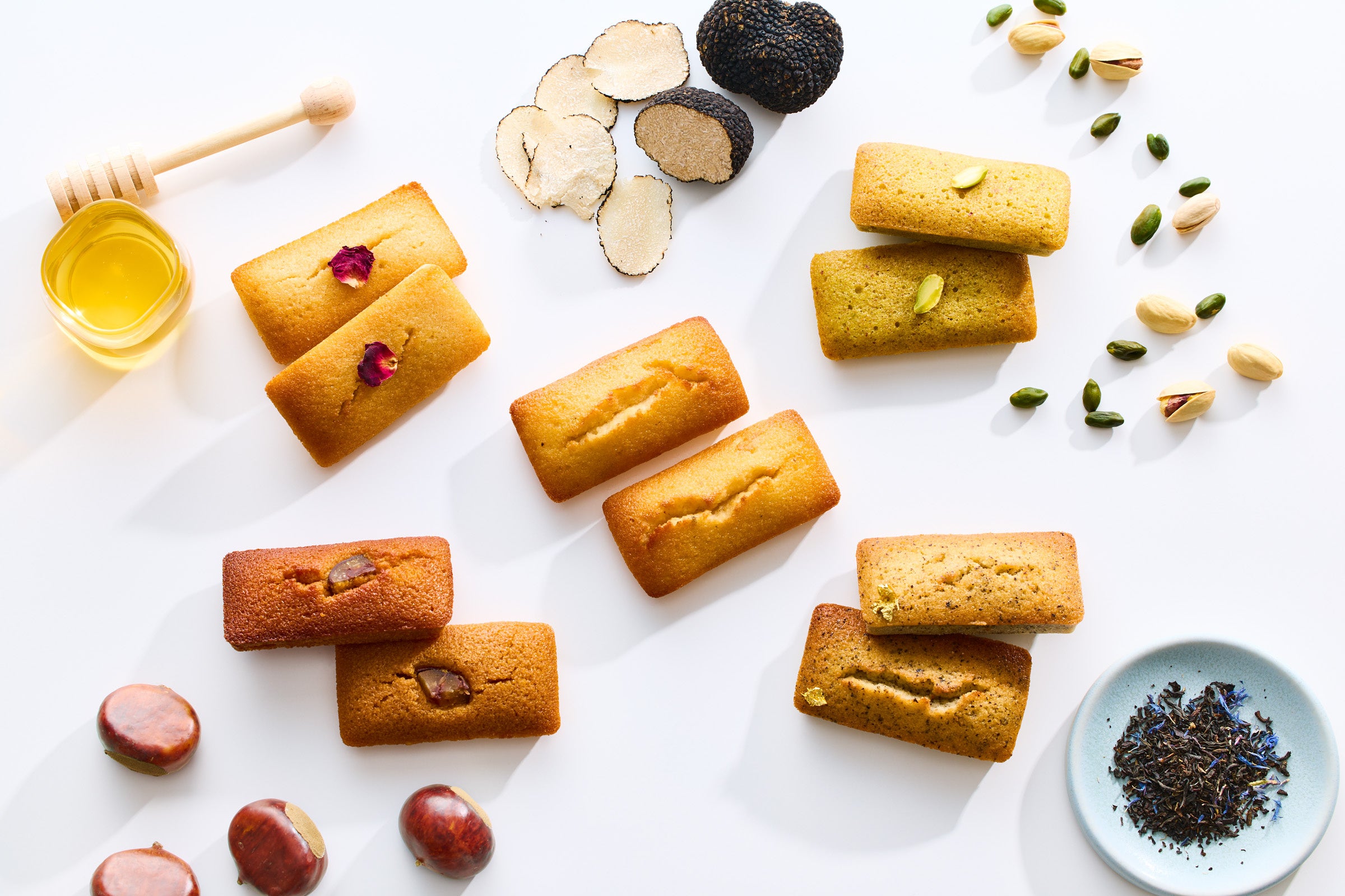 「アニヴェルセルカフェ」の人気商品でもあるショートケーキ、モンブランをはじめ、ティラミス、ムース、タルトの生菓子5種をご提供いたします。また、トリュフなどの贅沢な食材を使用し、香りや季節感にもこだわったフィナンシェを5種ご用意しました。中でも、社名の由来にもなった絵画『アニヴェルセル』に登場するバラの花束から発想を得て開発した「ローズハニー」味にはご注目いただきたいです。すべてのスイーツがテイクアウト可能で、また店内のカフェラウンジでもお召し上がりいただけます。さらには、ギフト用のフィナンシェBOXもご用意しています。
