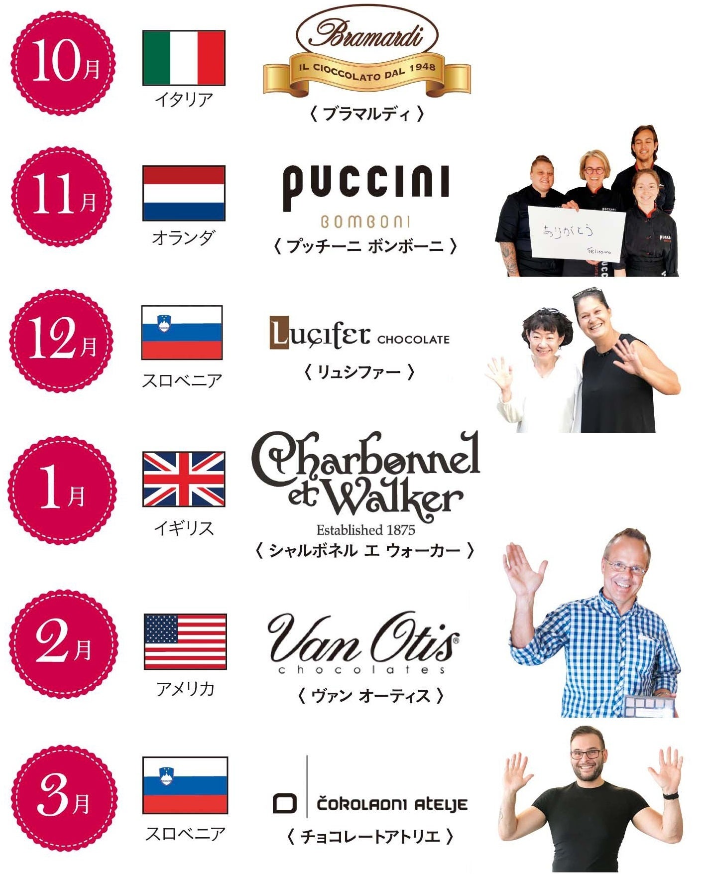 後半6ヵ月のショコラティエはバイヤーが自信を持っておすすめするあのブランド。イタリア、オランダ、スロベニア、イギリスなど、世界の国々から「幸福のチョコレート」でおなじみのブランドも新作を織り交ぜて、リピーターにも初めましての人も楽しめるラインナップです。